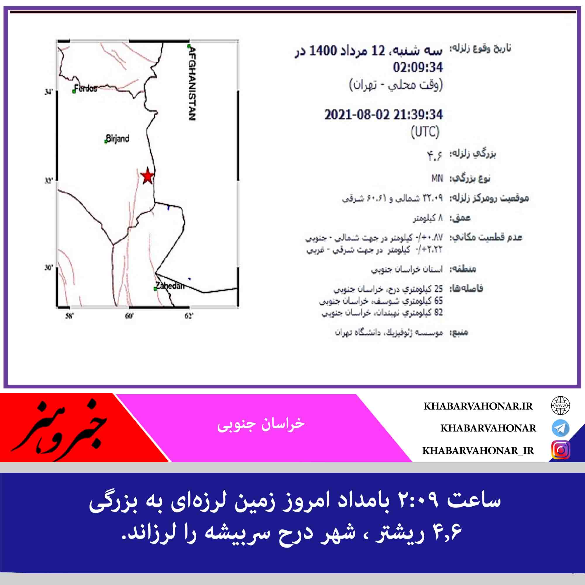 میرجلیلی مدیرکل مدیریت بحران استان ، گفت : ساعت ۲:۰۹ بامداد امروز زمین لرزهای به بزرگی ۴.۶ ریشتر ، در عمق ۸ کیلومتری درح خراسان جنوبی را لرزاند.