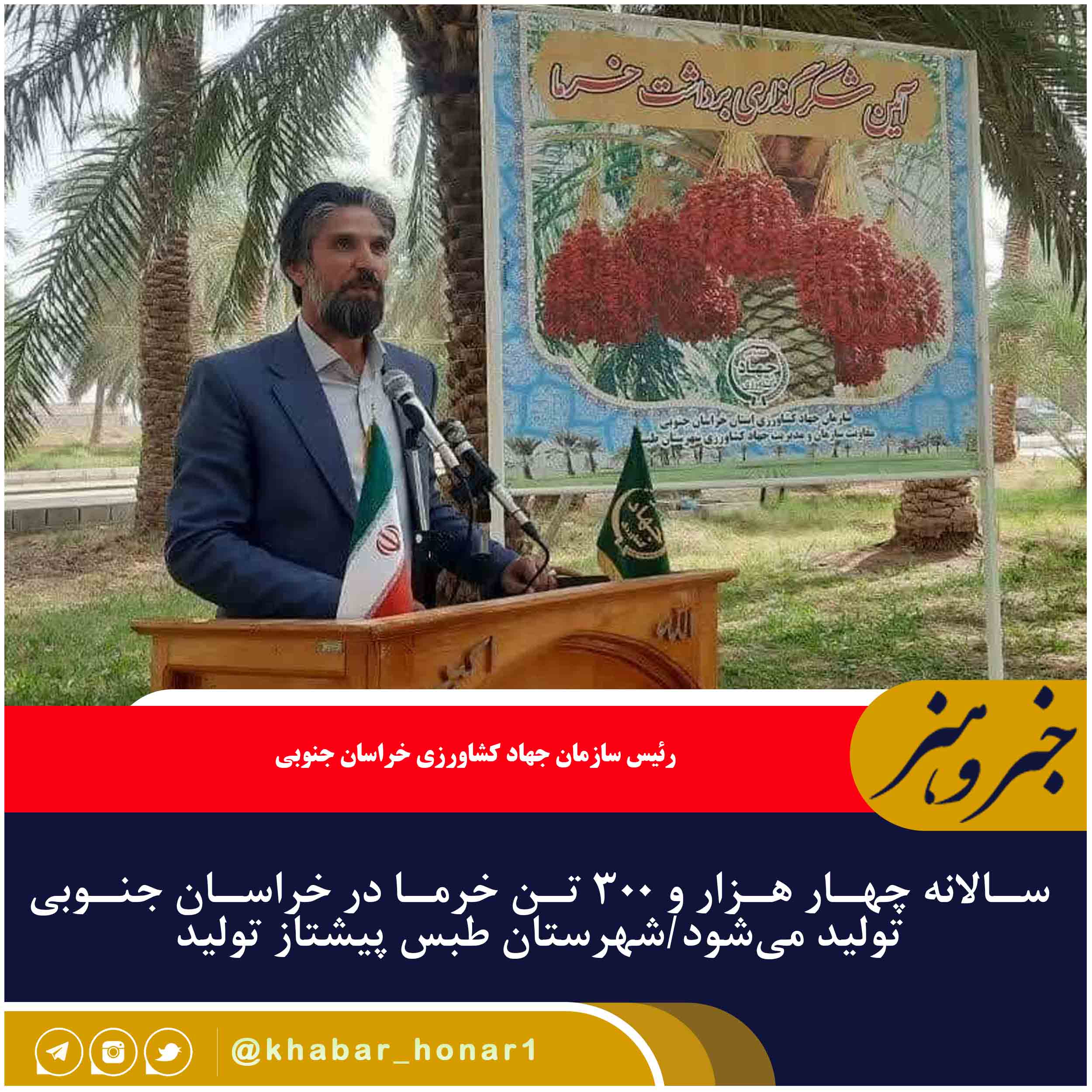 مراسم شکرگزاری برداشت خرما با حضور رئیس سازمان جهاد کشاورزی خراسان جنوبی، نماینده مردم فردوس، طبس، بشرویه و سرایان در مجلس شورای اسلامی، جمعی از مسئولان استانی و شهرستان طبس برگزار شد و با تقدیر از سه نخلکار نمونه همچنین کشاورز نمونه پرداخت کننده زکات خرما همراه بود.