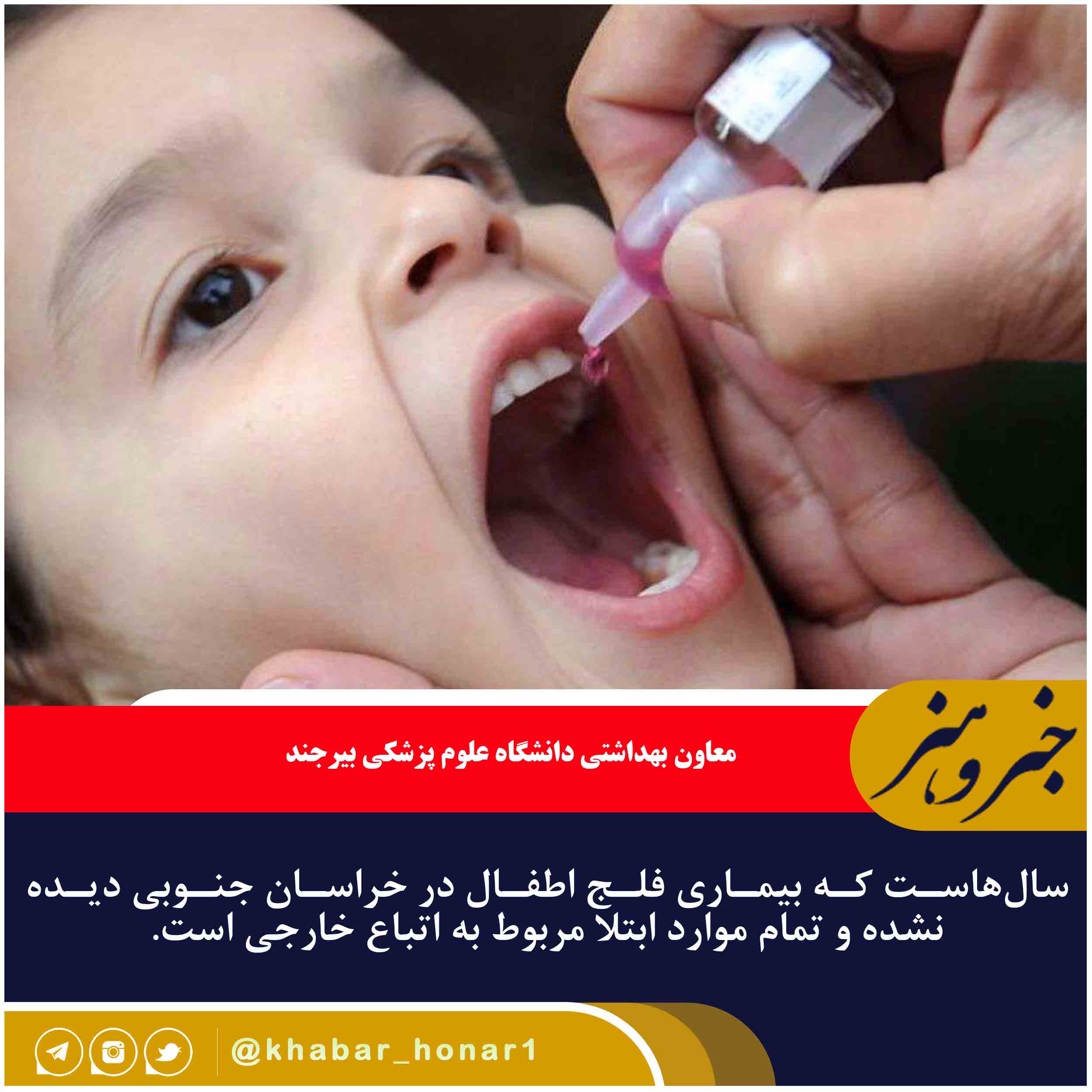 معاون بهداشتی دانشگاه علوم پزشکی بیرجند گفت: سالهاست که بیماری فلج اطفال در خراسان جنوبی دیده نشده و تمام موارد ابتلا مربوط به اتباع خارجی است.