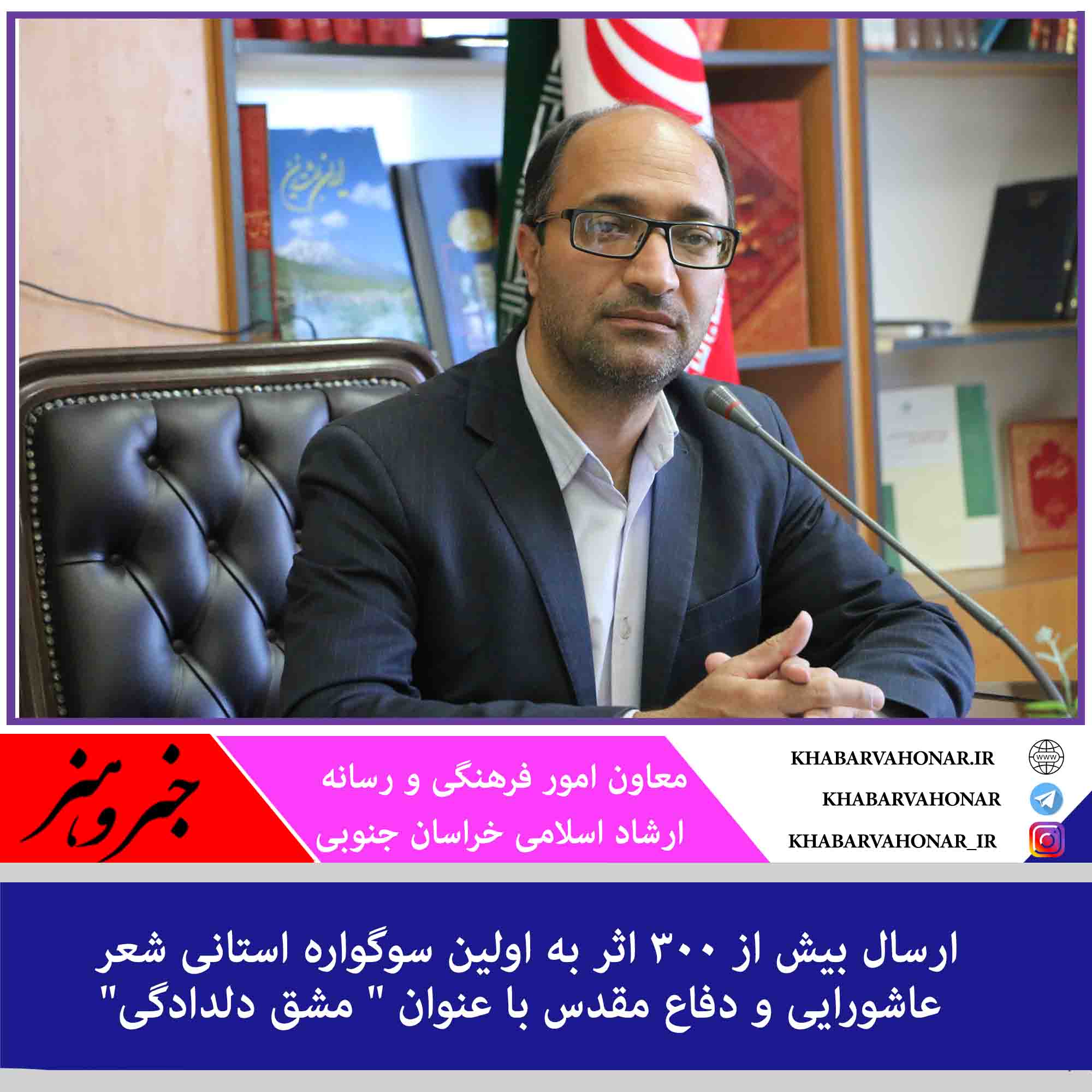معاون امور فرهنگی و رسانه اداره کل فرهنگ و ارشاد اسلامی خراسان جنوبی از ارسال بیش از ۳۰۰ اثر به اولین سوگواره استانی شعر عاشورایی و دفاع مقدس با عنوان ” مشق دلدادگی” خبر داد.محمود رمضانی با بیان این خبر عنوان کرد: با پایان یافتن مهلت ارسال آثار به دبیرخانه سوگواره، از ۱۱ شهرستان استان آثار متعددی ارسال شد که داوری آن ها به زودی انجام خواهد گرفت.