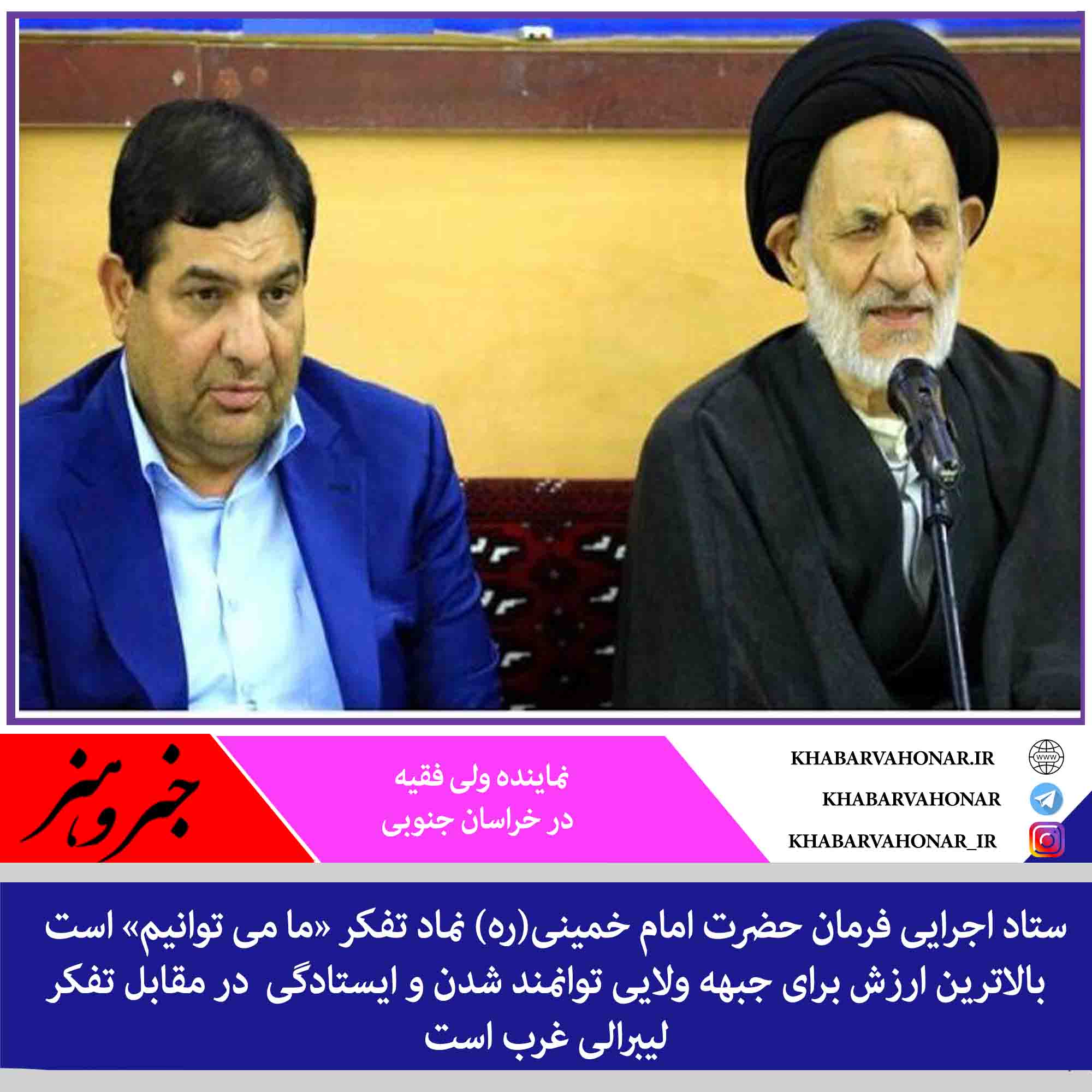 نماینده ولی فقیه در خراسان جنوبی با بیان اینکه ستاد اجرایی فرمان حضرت امام خمینی(ره) نماد تفکر «ما می توانیم»است، گفت: بالاترین ارزش برای جبهه ولایی توانمند شدن و ایستادگی در مقابل تفکر لیبرالی غرب است.