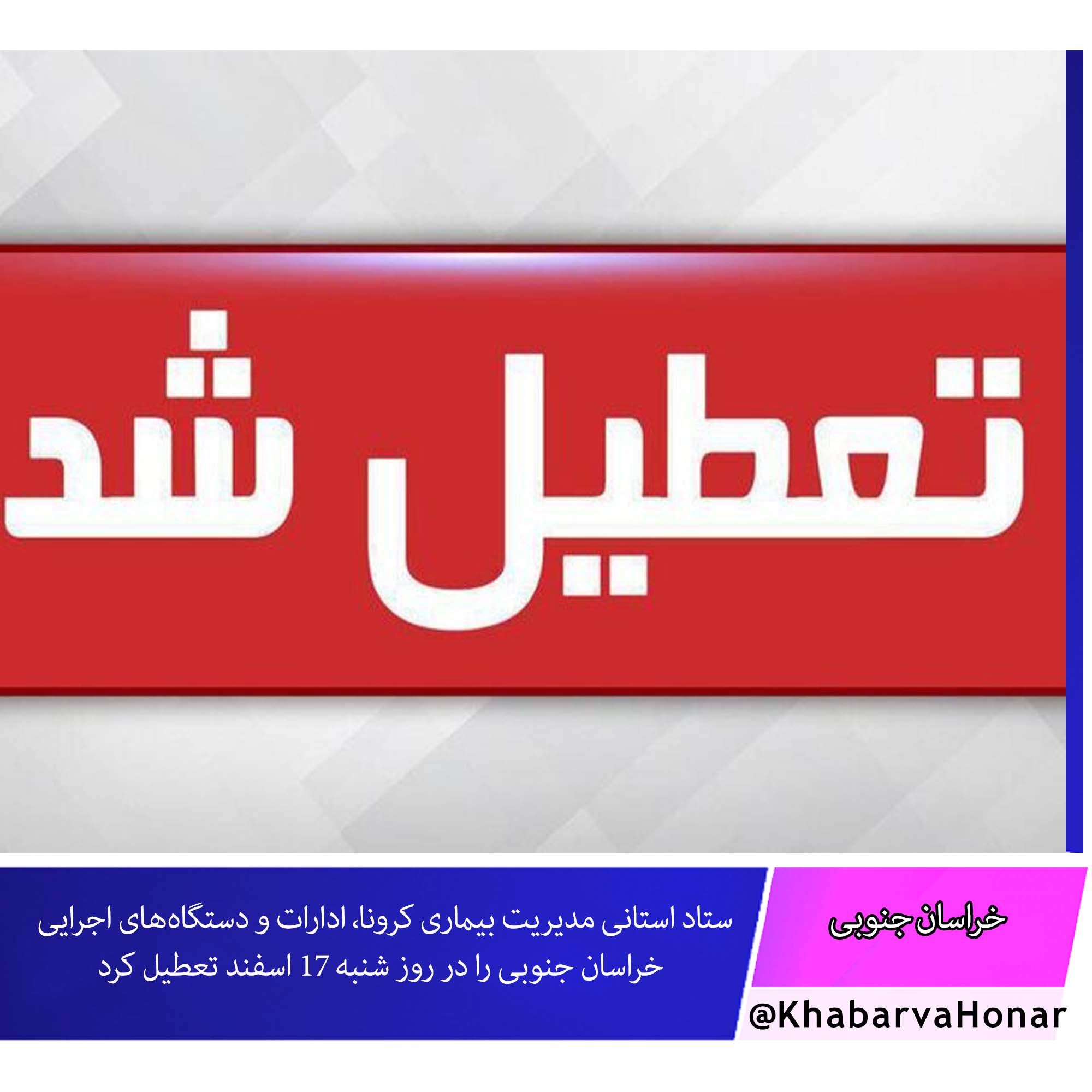 ستاد استانی مدیریت بیماری کرونا، ادارات و دستگاههای اجرایی خراسان جنوبی را در روز شنبه ۱۷ اسفند تعطیل کرد.