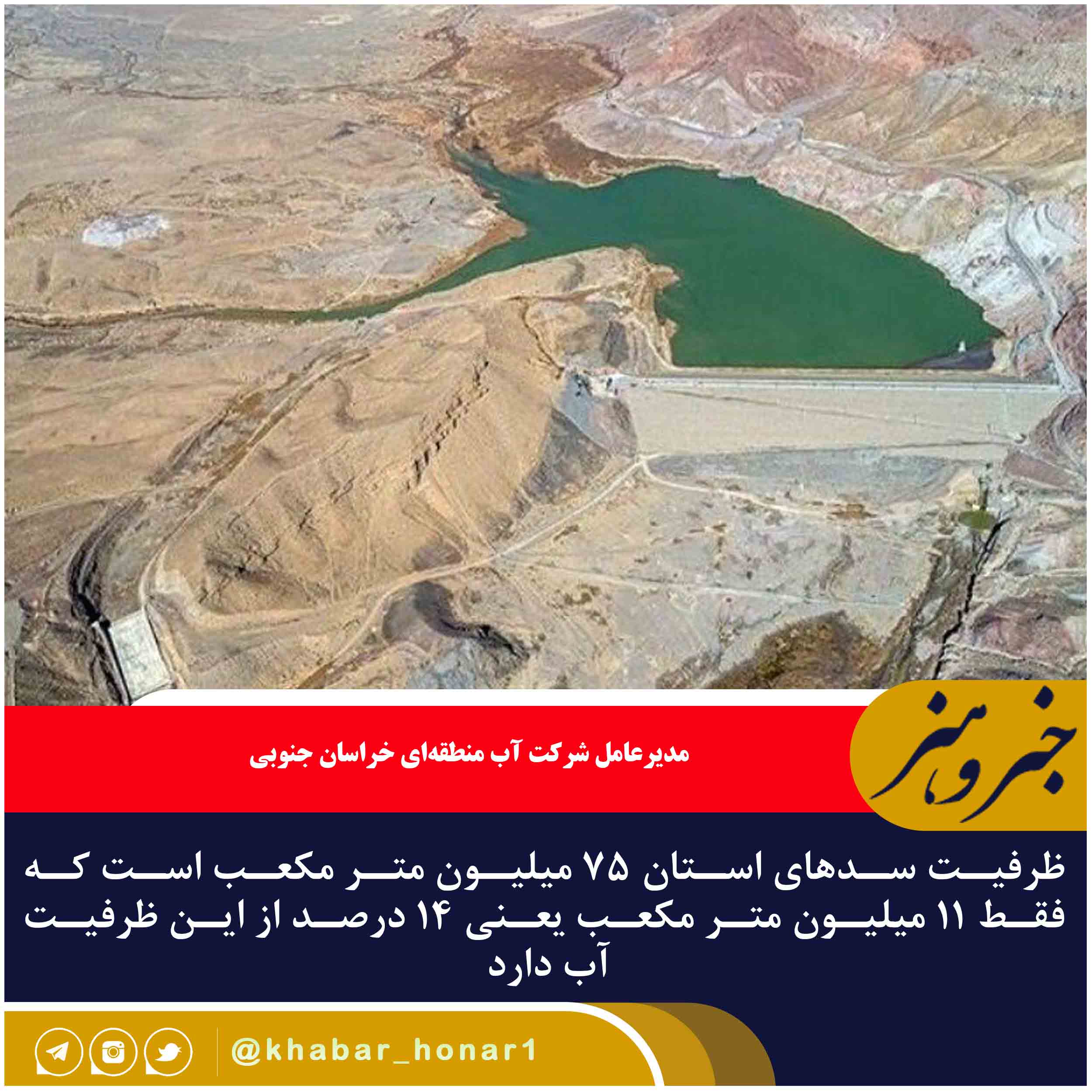 مدیرعامل شرکت آب منطقهای خراسان جنوبی گفت: ظرفیت سدهای استان ۷۵ میلیون متر مکعب است که فقط ۱۱ میلیون متر مکعب یعنی ۱۴ درصد از این ظرفیت آب دارد.