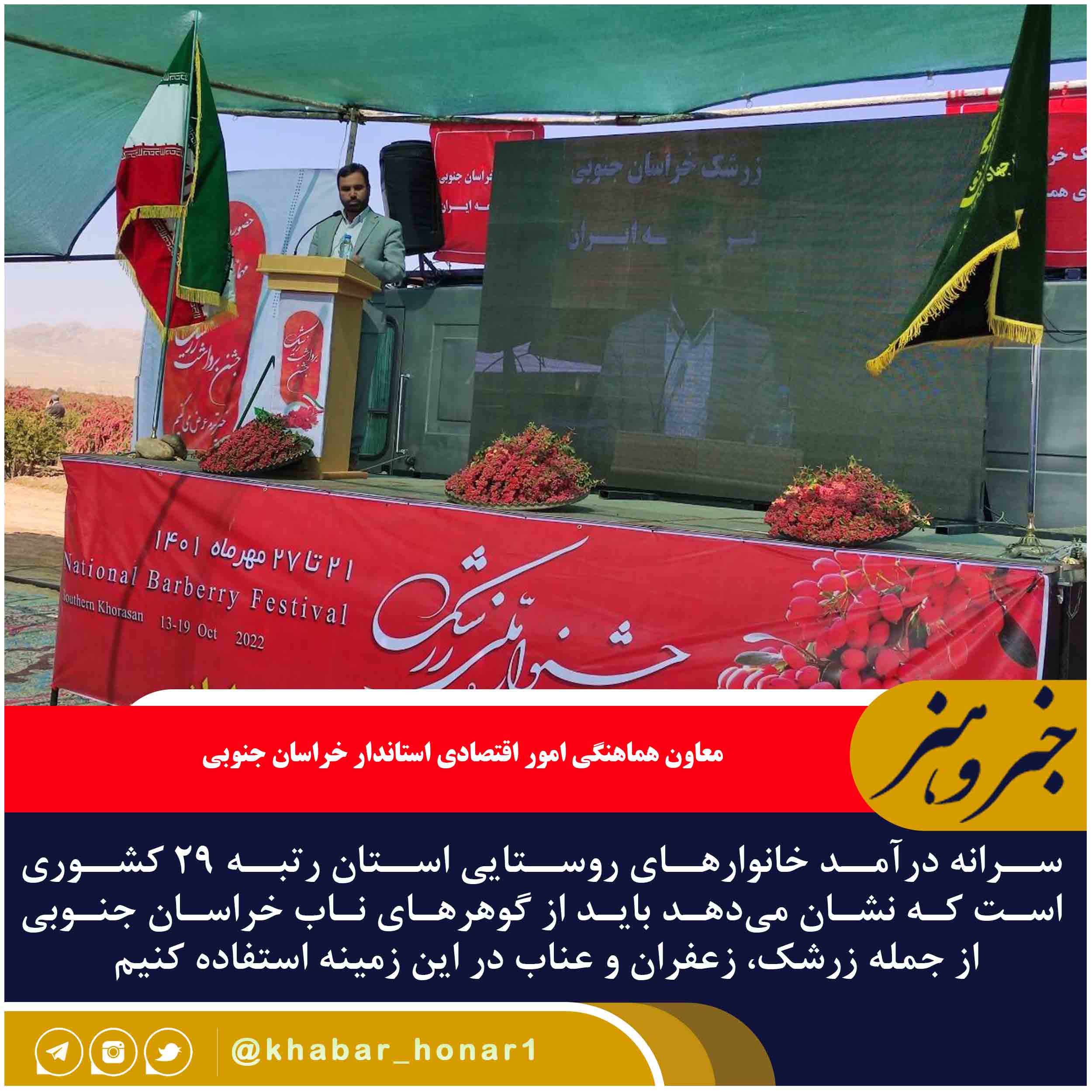 اولین جشنواره ملی زرشک روز پنجشنبه – ۲۱ مهر – با حضور جمعی از مسوولان کشوری و استانی در روستای افین شهرستان زیرکوه آغاز به کار کرد و روزهای گذشته در شهرستانهای قاینات و سربیشه برگزار شد.
