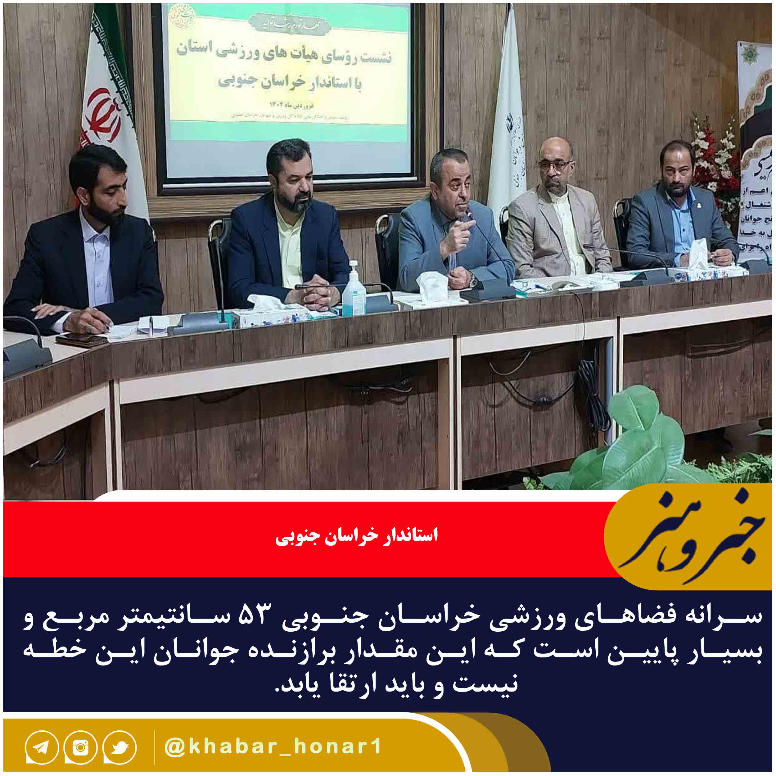 استاندار خراسان جنوبی گفت: سرانه فضاهای ورزشی خراسان جنوبی ۵۳ سانتیمتر مربع و بسیار پایین است که این مقدار برازنده جوانان این خطه نیست و باید ارتقا یابد.