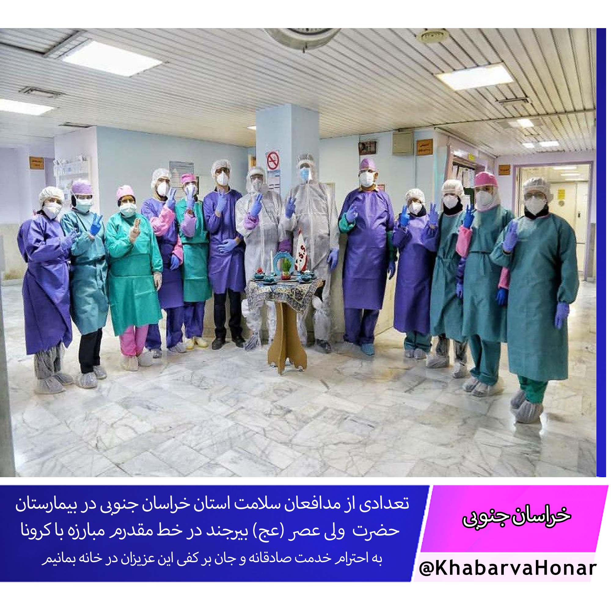 تعدادی از مدافعان سلامت استان خراسان جنوبی در بیمارسان حضرت ولی عصر (عج) بیرجند در خط مقدرم مبارزه با کرونا به احترام خدمت صادقانه و جان بر کفی این عزیزان در خانه بمانیم