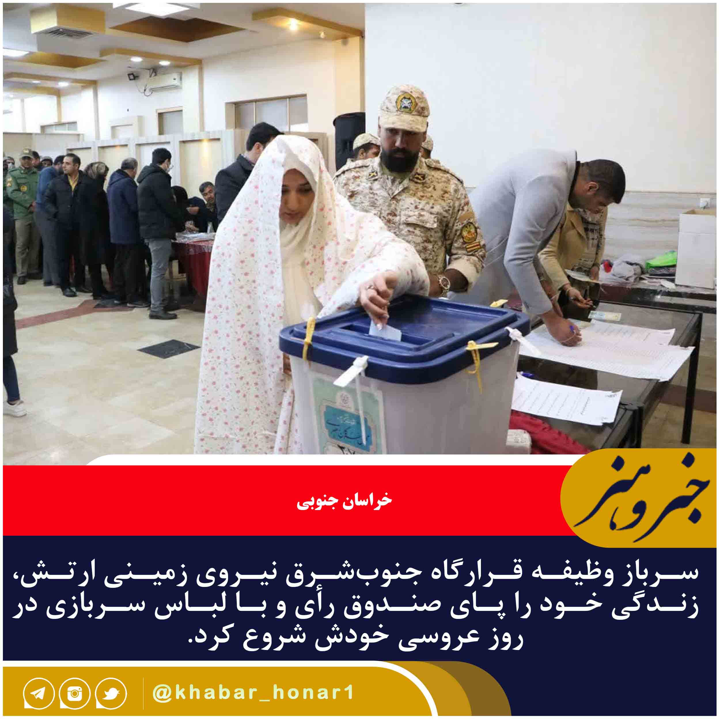 سرباز وظیفه قرارگاه جنوبشرق نیروی زمینی ارتش، زندگی خود را پای صندوق رأی و با لباس سربازی در روز عروسی خودش شروع کرد.