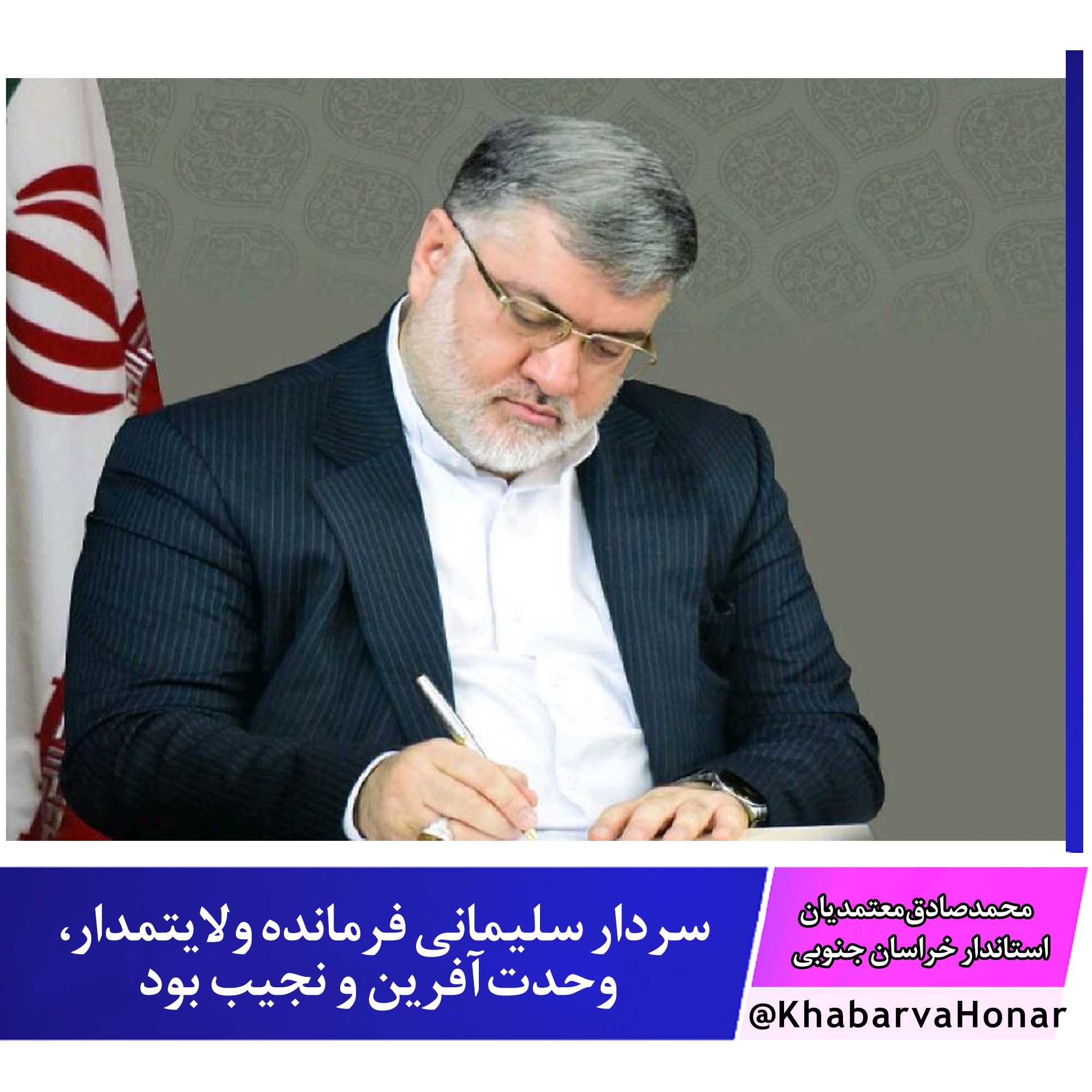 استاندار خراسان جنوبی بیان کرد: اینجانب شهادت بزرگمرد جهاد و شهادت، سردار سپهبد “حاج قاسم سلیمانی” و همراهان شهیدش را به محضر حضرت بقیه ا… الاعظم ارواحنا روحی له الفداه، ولی امر مسلمین جهان، آحاد ملت ایران، سپاه پاسداران انقلاب اسلامی، مردم شریف و ولایتمدار خراسان جنوبی و به ویژه خانواده گرامی ایشان تبریک و تسلیت عرض مینمایم و از خداوند متعال علو درجات را برای این شهید والامقام مسئلت دارم.