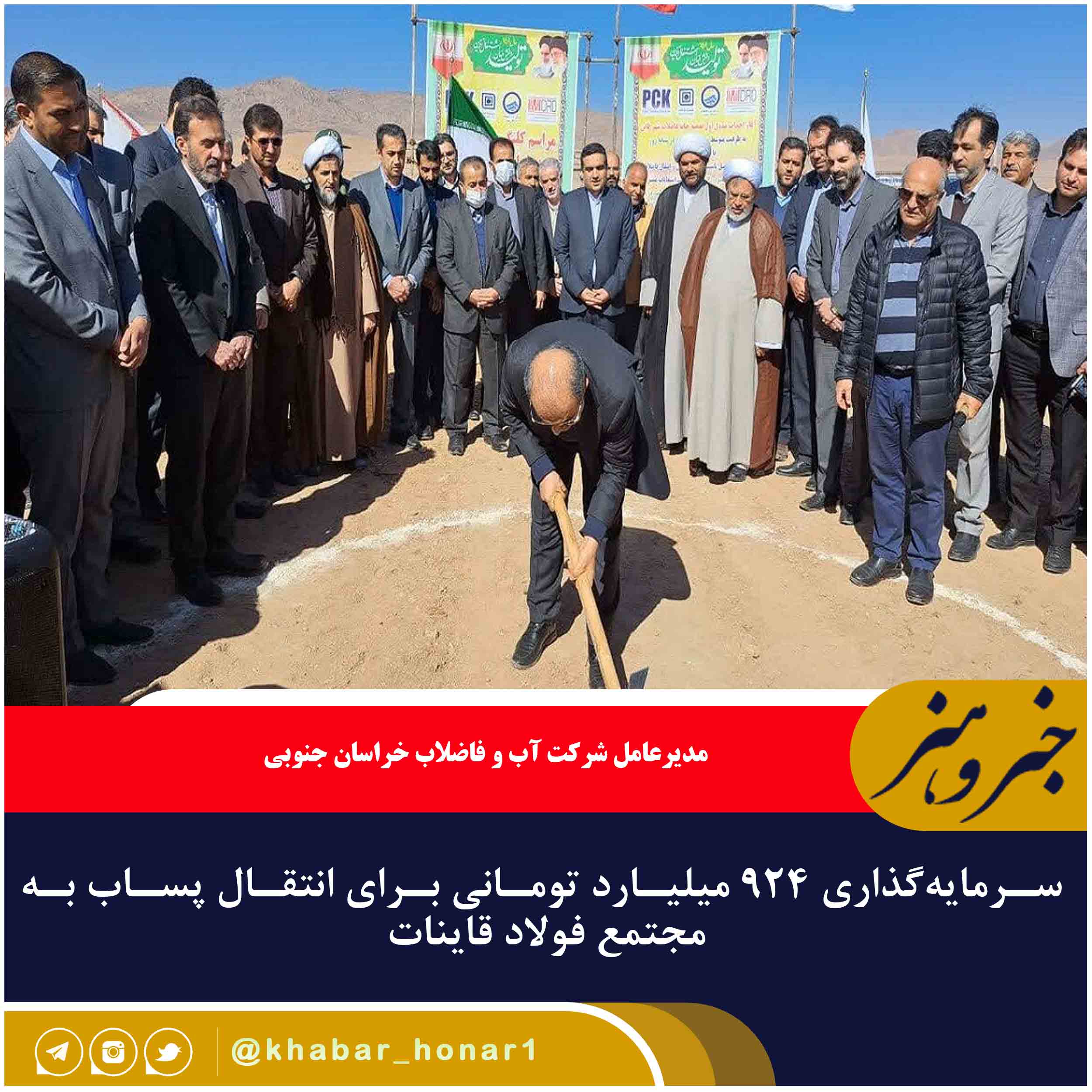 مراسم انعقاد قرارداد و آغاز عملیات اجرایی احداث مدول اول تصفیهخانه فاضلاب شهر قاین و شبکه جمعآوری فاضلاب با هدف تامین آب پایدار مورد نیاز مجتمع فولاد قاینات امروز با حضور رئیس هیات عامل ایمیدرو، استاندار خراسان جنوبی، نماینده مردم قاینات و زیرکوه در مجلس شورای اسلامی، مسوولان شرکت ملی فولاد ایران، شرکت آب و فاضلاب و مسوولان محلی در فرمانداری قاینات برگزار شد.