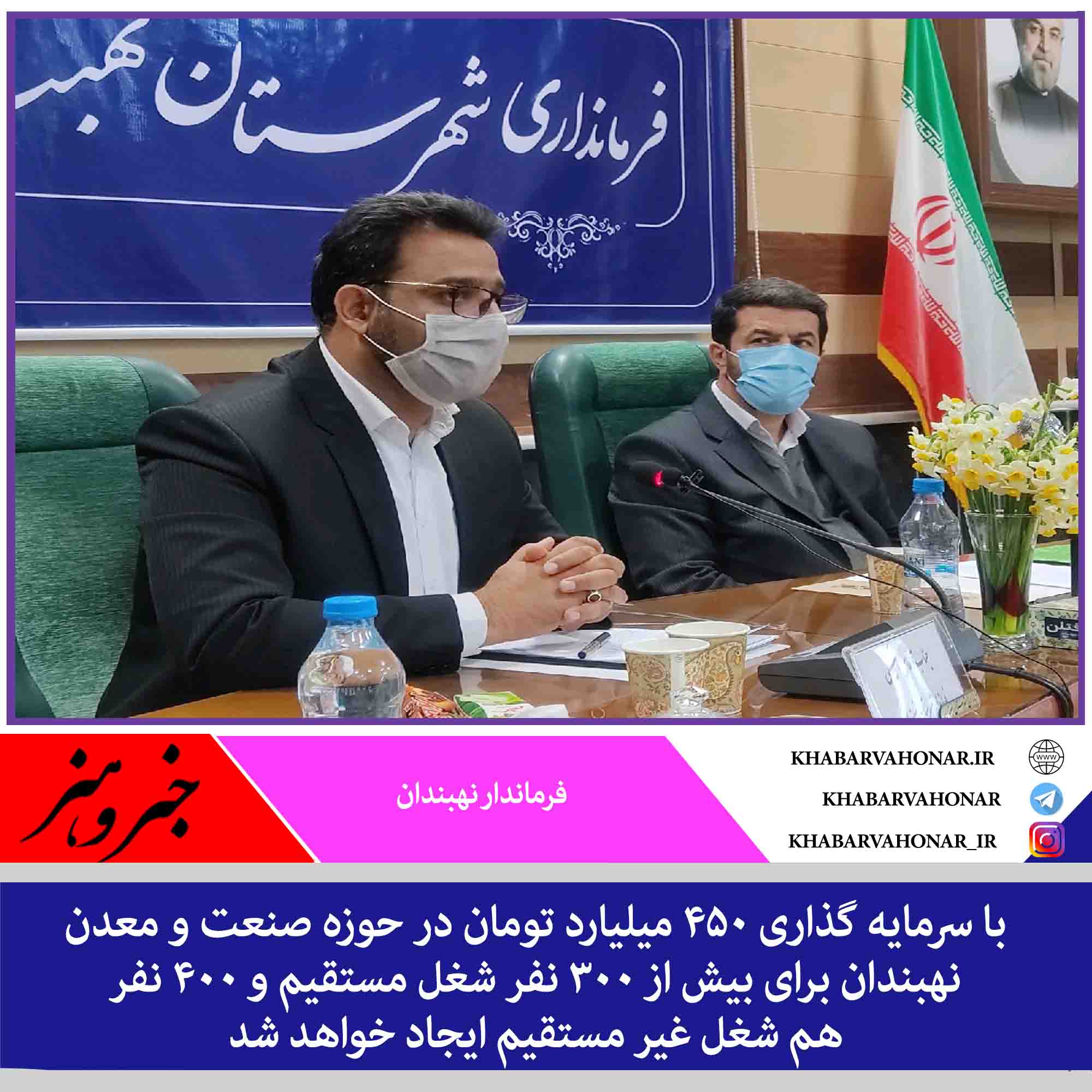 با سرمایه گذاری ۴۵۰ میلیارد تومان در حوزه صنعت و معدن نهبندان برای بیش از ۳۰۰ نفر شغل مستقیم و ۴۰۰ نفر هم شغل غیر مستقیم ایجاد خواهد شد.