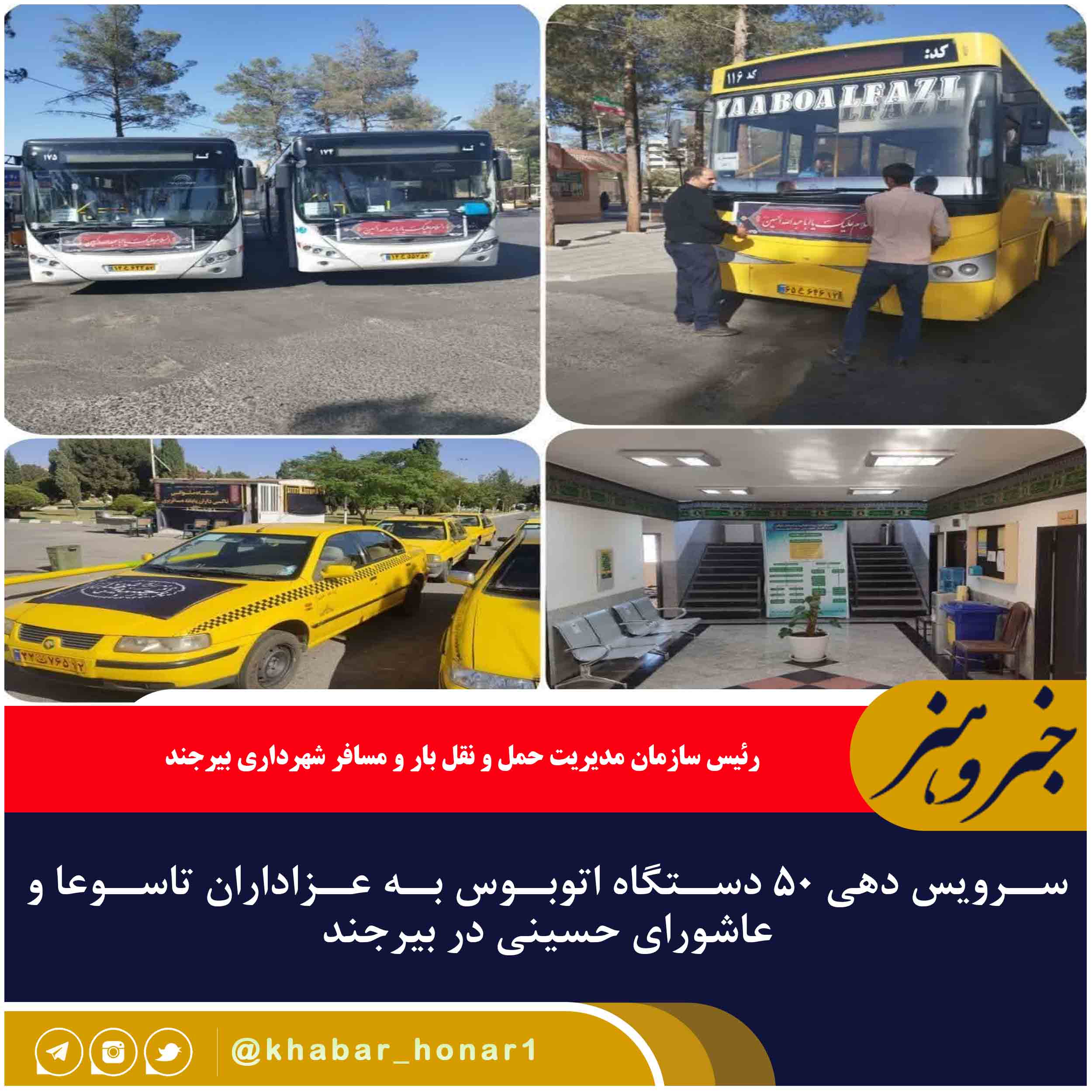 سازمان حمل و نقل بار و مسافر شهرداری بیرجند در روزهای تاسوعا و عاشورای حسینی به عزاداران این شهر با ۵۰ دستگاه اتوبوس سرویس دهی میکند.