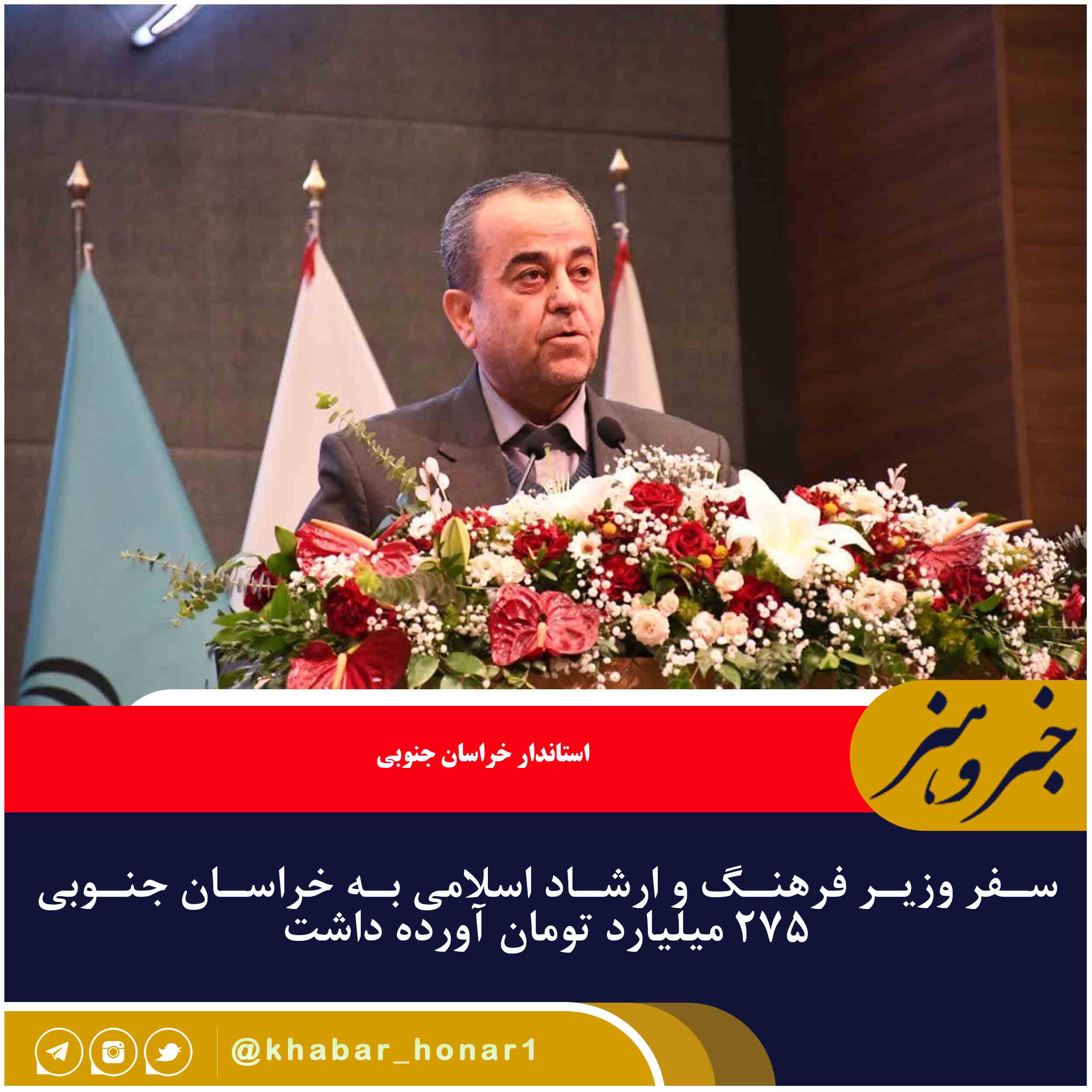 ?استاندار خراسان جنوبی گفت: سفر آبان ماه وزیر فرهنگ و ارشاد اسلامی به استان خراسان جنوبی ۲۷۵ میلیارد تومان آورده داشته است.