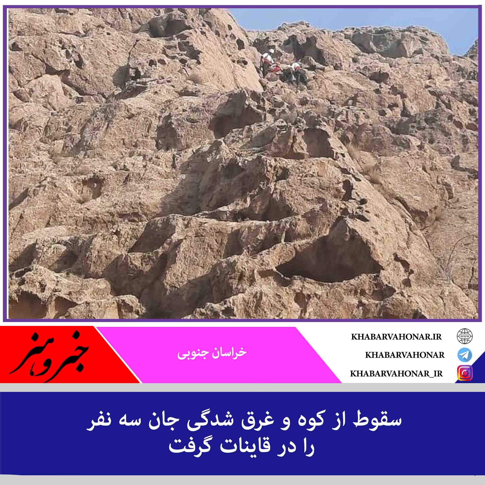 رییس جمعیت هلال احمر قاینات گفت: حادثه دیگر امروز در ارتفاعات ۱۵ کیلومتری شرق قاین روی داد و ۲ نوجوان ۱۷ ساله به کوهنوردی رفتند که یکی از آنان با سقوط از ارتفاع ۱۵۰ متری جان خود را از دست داد و نوجوان دیگر با کمک تیم کوهستان جمعیت هلال احمر قاینات از ارتفاع به پایین هدایت شد.