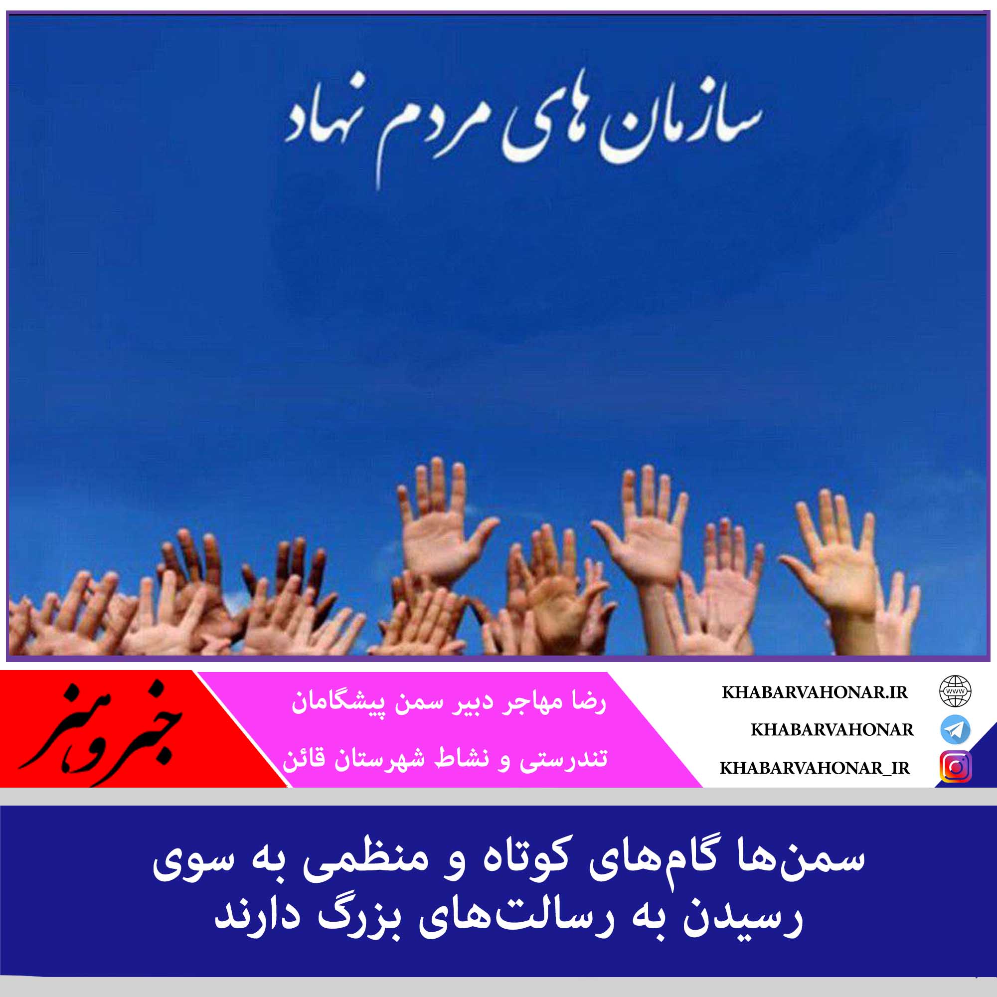 رضا مهاجر دبیر سمن پیشگامان تندرستی و نشاط شهرستان قائن سمن ها را یکی از گامهای اساسی برای رسیدن به رسالت بزرگ دانست و گفت: سمنها گامهای کوتاه و منظمی به سوی رسیدن به رسالتهای بزرگ دارند و با این فعالیتهای اجتماعی چطور زندگی کردن را میآموزیم.