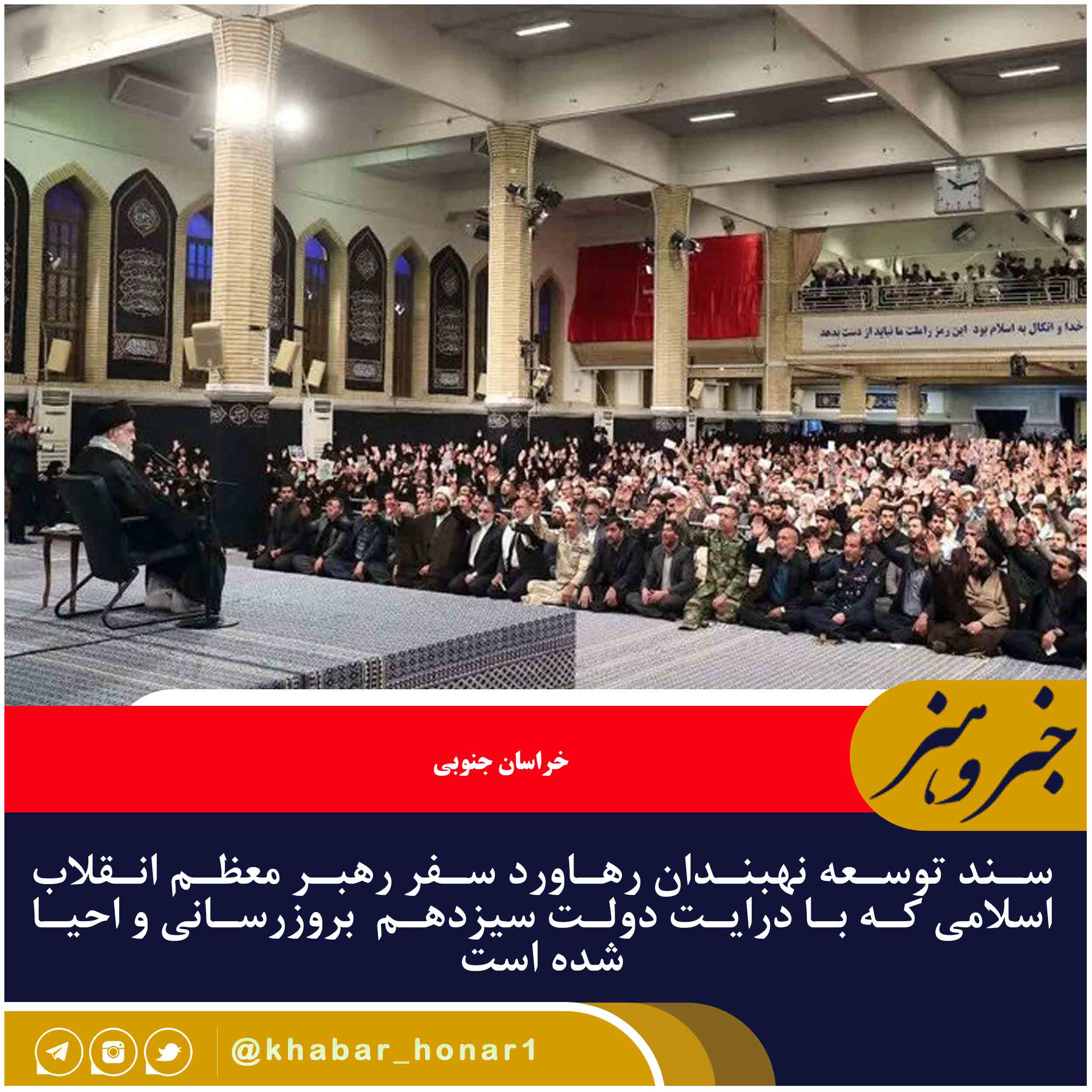 سند توسعه نهبندان رهاورد سفر رهبر معظم انقلاب اسلامی در سال ۱۳۷۸ به این شهرستان مرزی و محروم است که در سالیان گذشته به دلایلی اجرای آن به تاخیر افتاد اما در دولت سیزدهم با دستور رئیس جمهور بازنگری شده تا به مرحله اجرا برسد.
