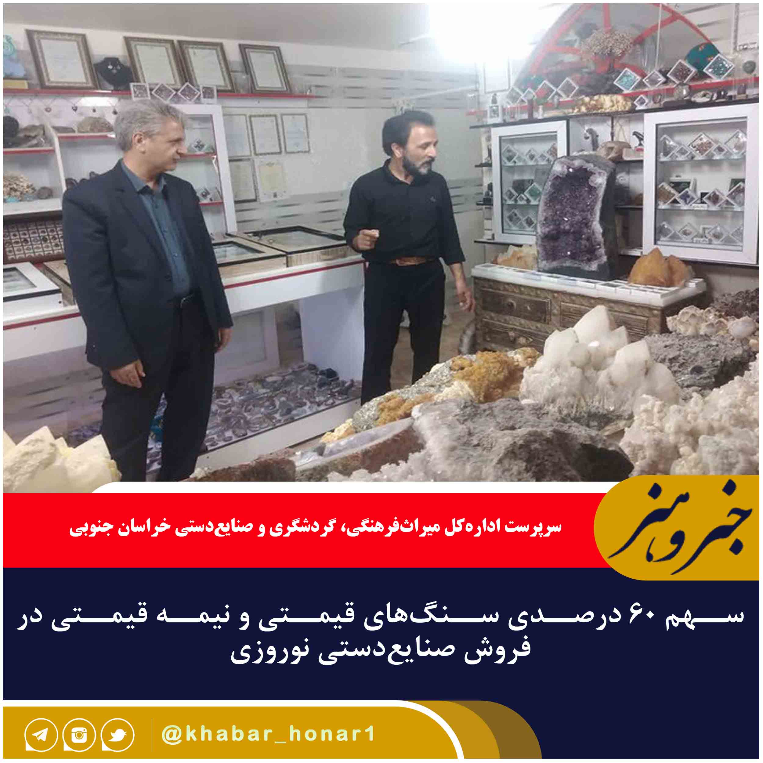 سرپرست اداره‌کل میراث‌فرهنگی، گردشگری و صنایع‌دستی خراسان جنوبی گفت: از فروش محصولات صنایع‌دستی استان در ایام نوروز ۶۰ درصد مربوط به سنگ‌های قیمتی و نیمه قیمتی بوده است.