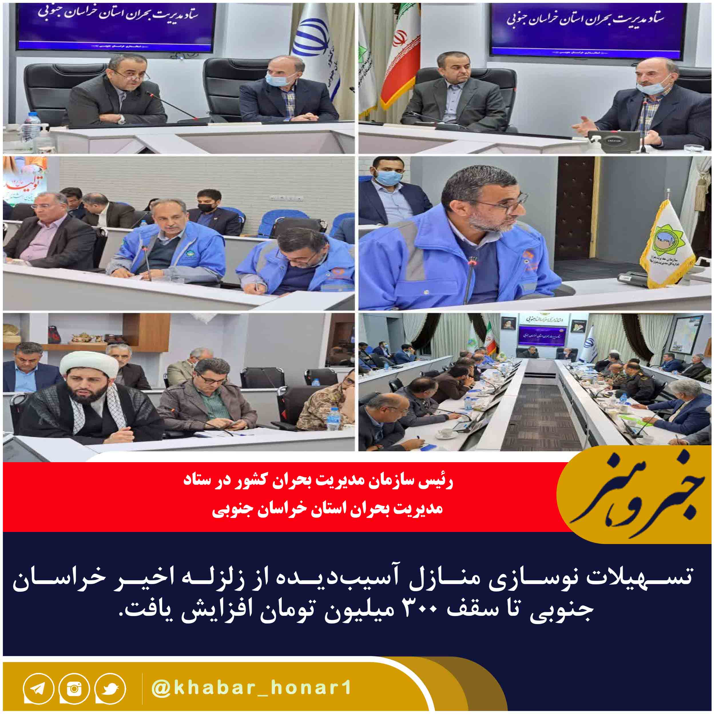 رئیس سازمان مدیریت بحران کشور گفت: تسهیلات نوسازی منازل آسیبدیده از زلزله اخیر خراسان جنوبی تا سقف ۳۰۰ میلیون تومان افزایش یافت.