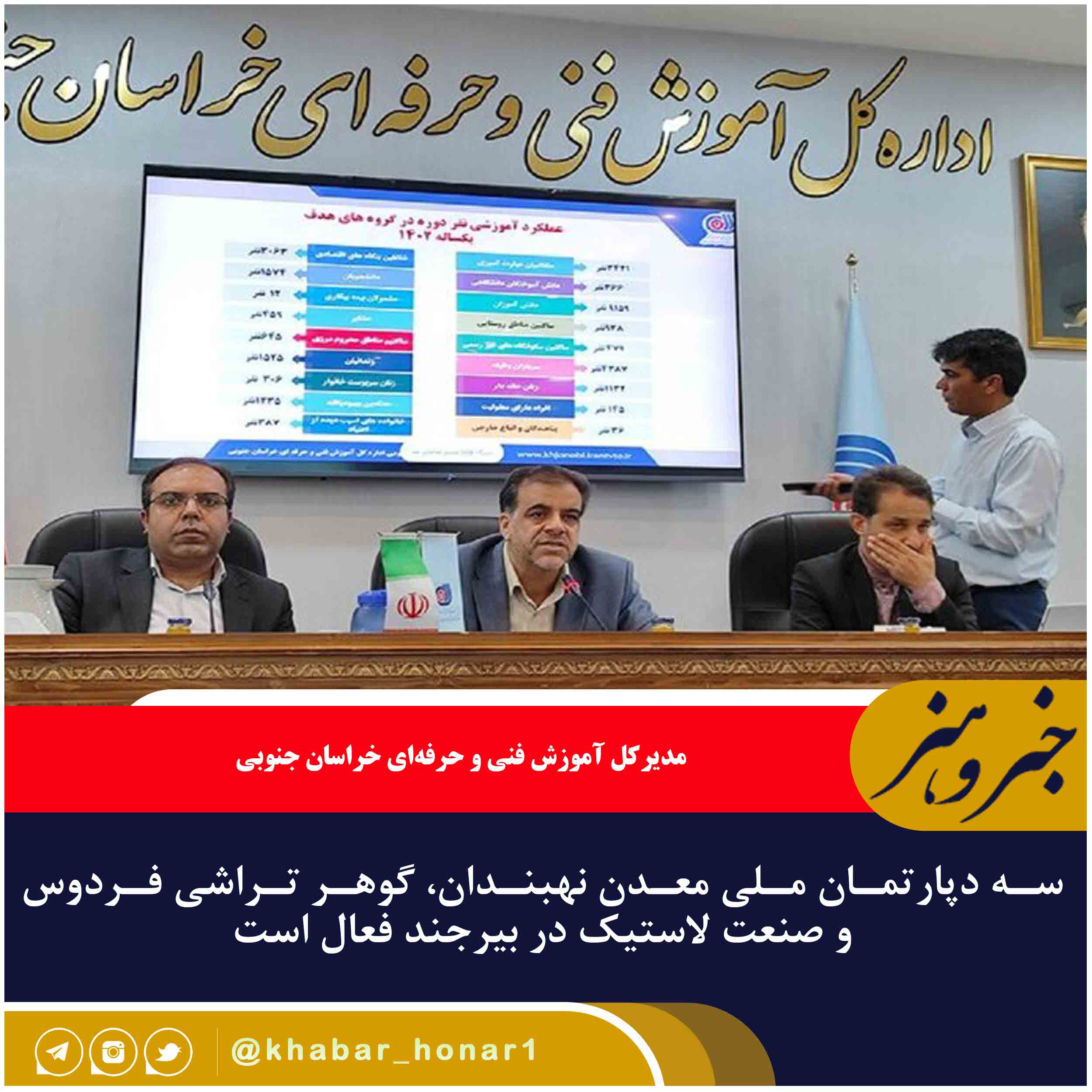 مدیرکل آموزش فنی و حرفهای خراسان جنوبی گفت: اکنون سه دپارتمان ملی معدن نهبندان، گوهر تراشی فردوس و صنعت لاستیک در بیرجند فعال است که نقش بسزایی در توسعه مهارت آموزی دارند.
