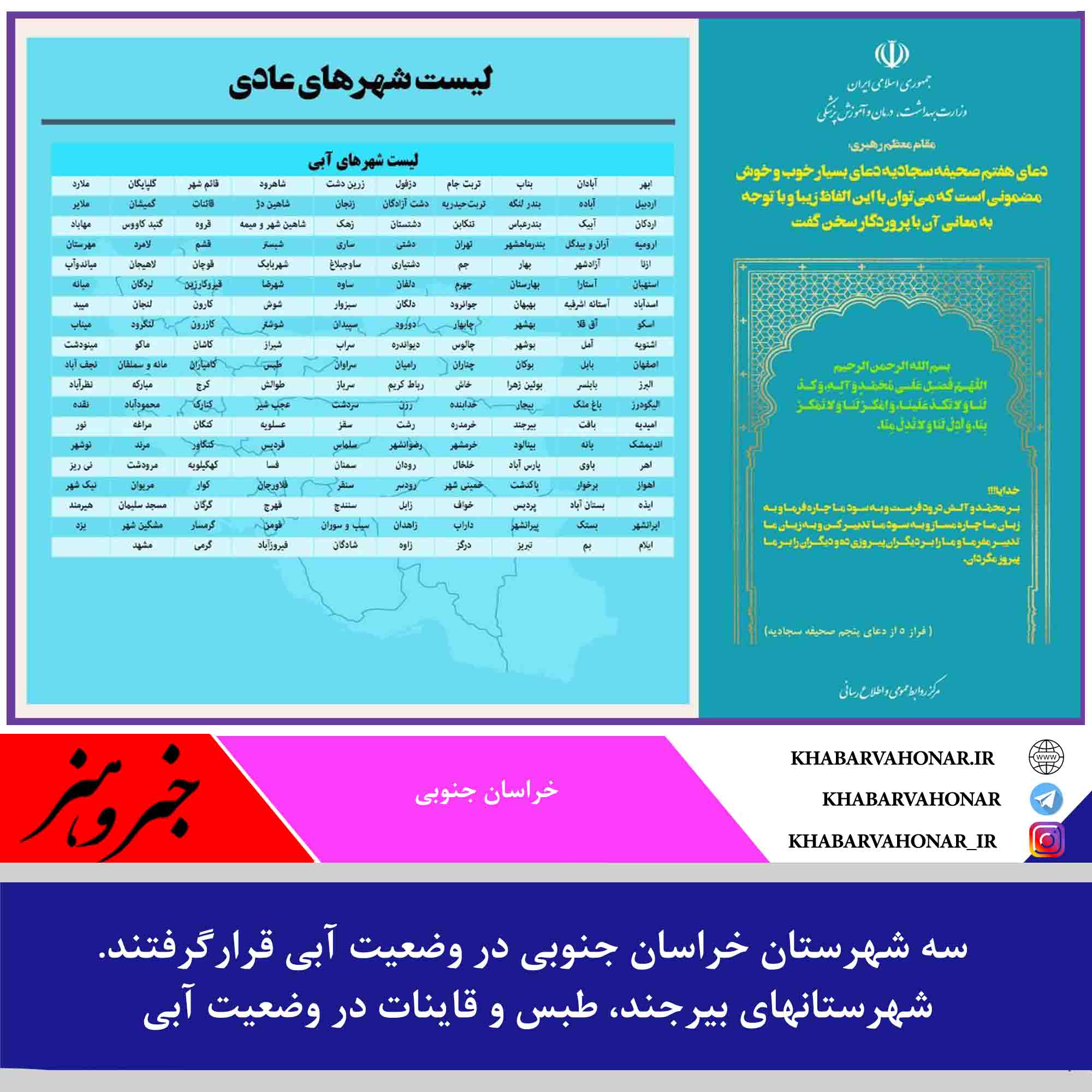 براساس آخرین بروزرسانی نقشه کرونایی کشور شهرستانهای بیرجند، طبس و قاینات در وضعیت آبی و سایرشهرهای استان در وضعیت زرد قرار دارن