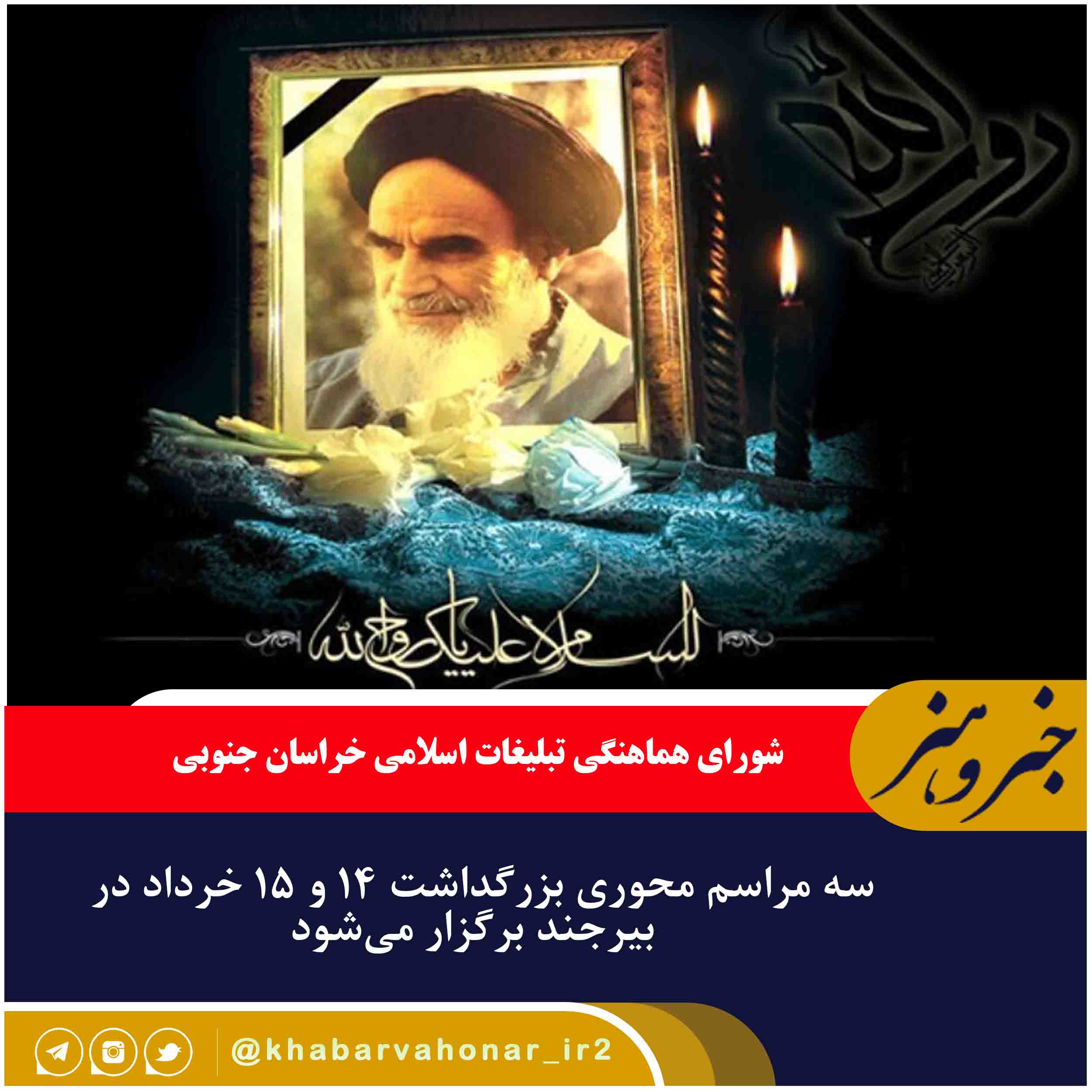 ویژه برنامههای سی و سومین سالگرد ارتحال ملکوتی امام خمینی (ره) و پنجاه و نهمین سالگرد قیام خونین ۱۵ خرداد در شهر بیرجند، روز جمعه ۱۳ خرداد ساعت ۲۰ در حسینیه جماران با سخنرانی حجتالاسلام “علی شیرازی” جانشین سازمان عقیدتی سیاسی وزارت دفاع و پشتیبانی نیروهای مسلح و روز شنبه ساعت ۱۸ در محل مدرسه علمیه سفیران هدایت برگزار میشود.