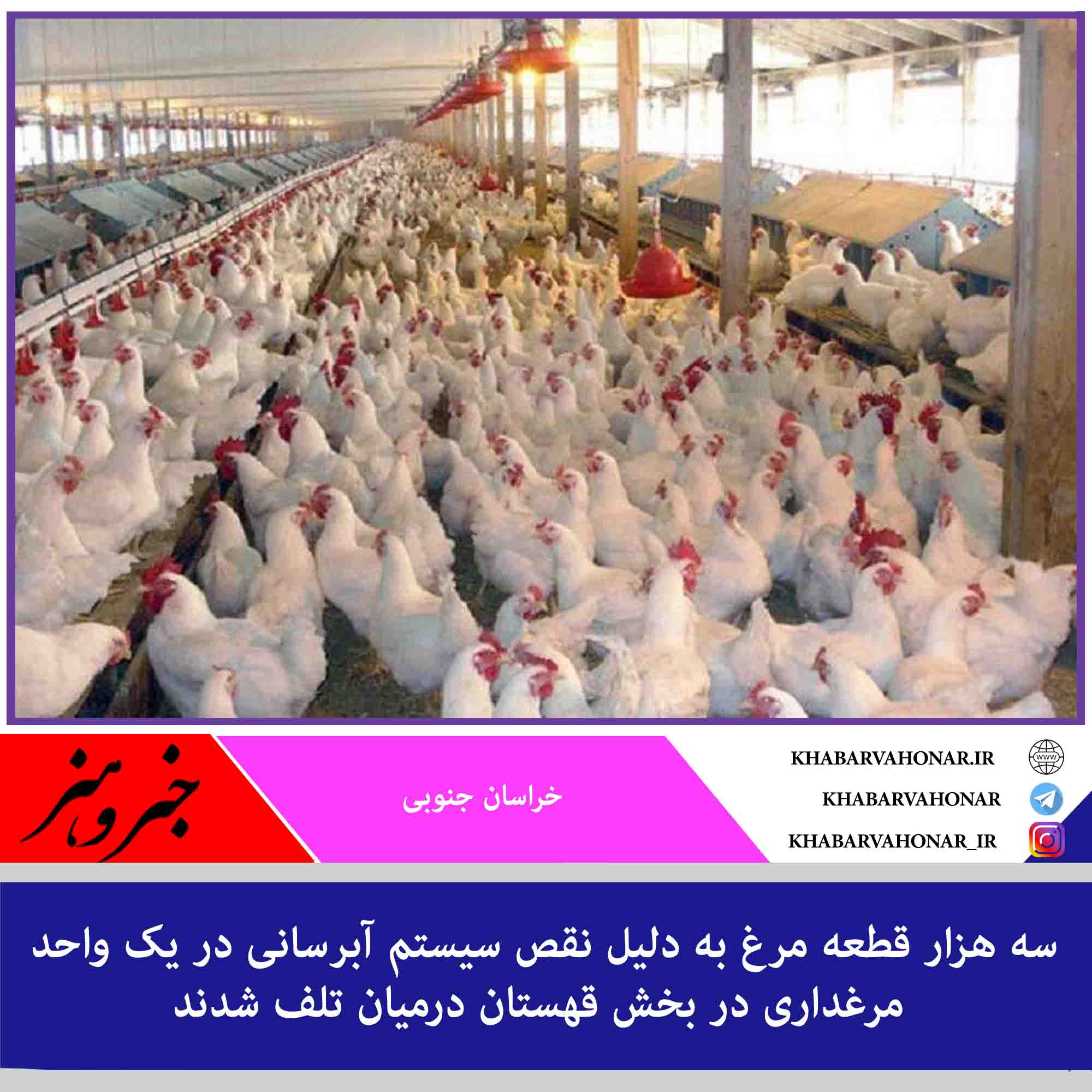 – رییس شبکه دامپزشکی درمیان گفت: سه هزار قطعه مرغ به دلیل نقص سیستم آبرسانی در یک واحد مرغداری در بخش قهستان این شهرستان تلف شدند.