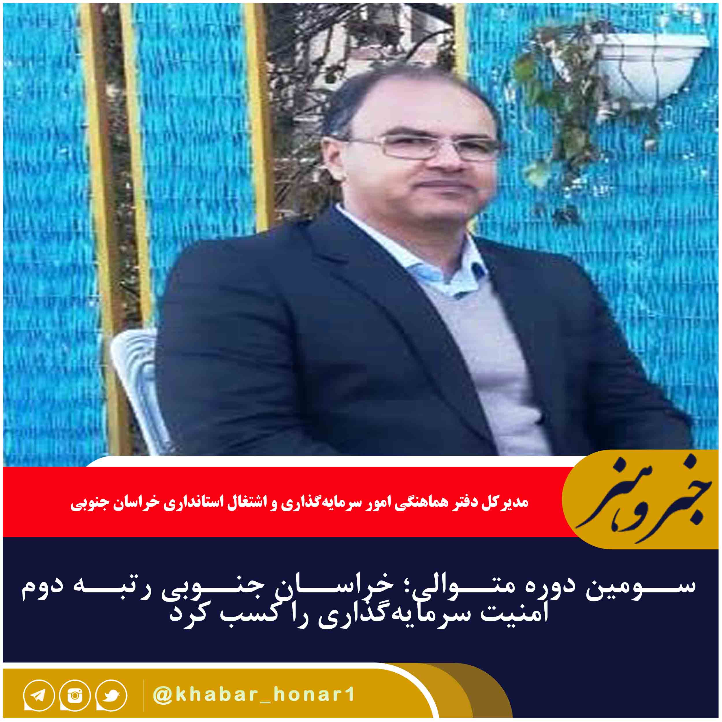 مدیرکل دفتر هماهنگی امور سرمایهگذاری و اشتغال استانداری خراسان جنوبی گفت: براساس پایش و ارزیابی مرکز پژوهشهای مجلس شورای اسلامی، خراسان جنوبی برای سومین دوره متوالی در شاخص ملی امنیت سرمایهگذاری، رتبه دوم را در بین استانهای کشور کسب کرد.