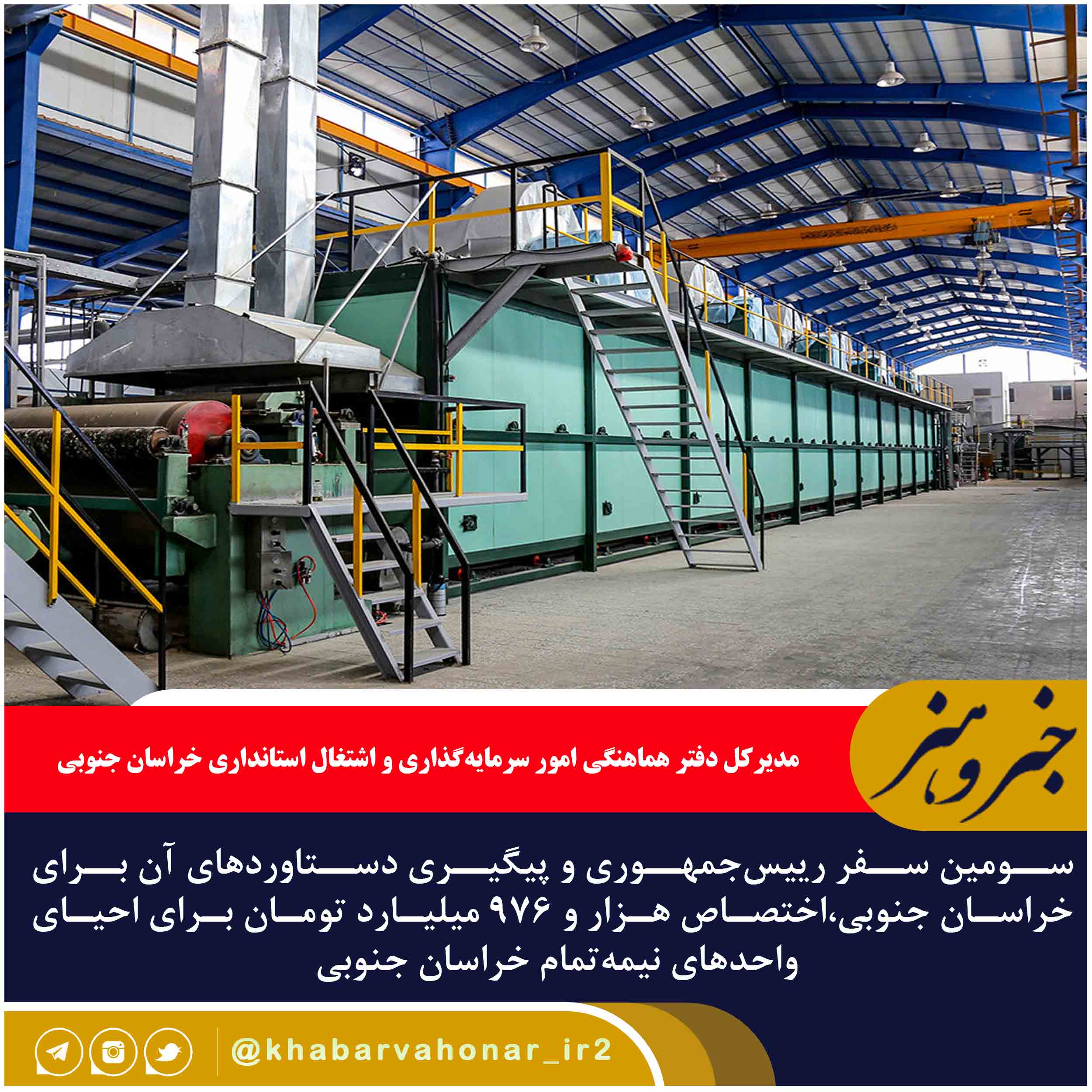 سومین سفر رییس‌جمهوری و پیگیری دستاوردهای آن برای خراسان جنوبی،اختصاص هزار و ۹۷۶ میلیارد تومان برای احیای واحدهای نیمه‌تمام خراسان جنوبی