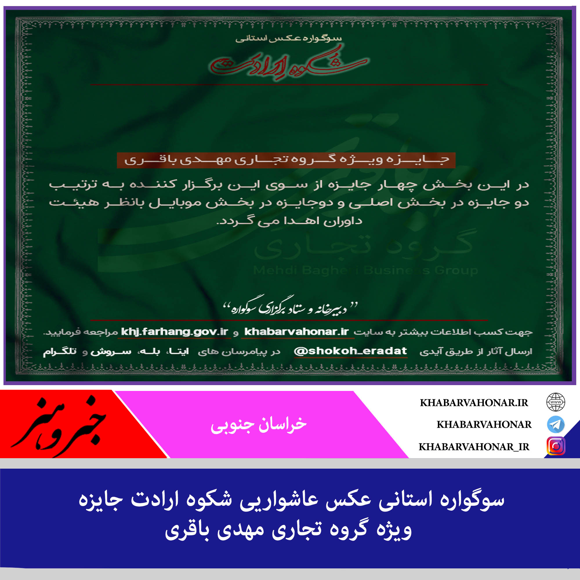 این جایز از سوی اداره کل میراث فرهنگی خراسان جنوبی اهدا می گردد . در این بخش چهار جایزه از سوی ا برگزار کننده به ترتیب دو جایزه در بخش اصلی و دوجایزه در بخش موبایل بانظر هیت داوران اهدا می گردد و مد نظر ایین های عاشواریی و میراث معنوی خراسان جنوبی در عزاداری ها می باشد . عکس ها می بایست منطبق بر محور ها اصلی مسابقه باشد .