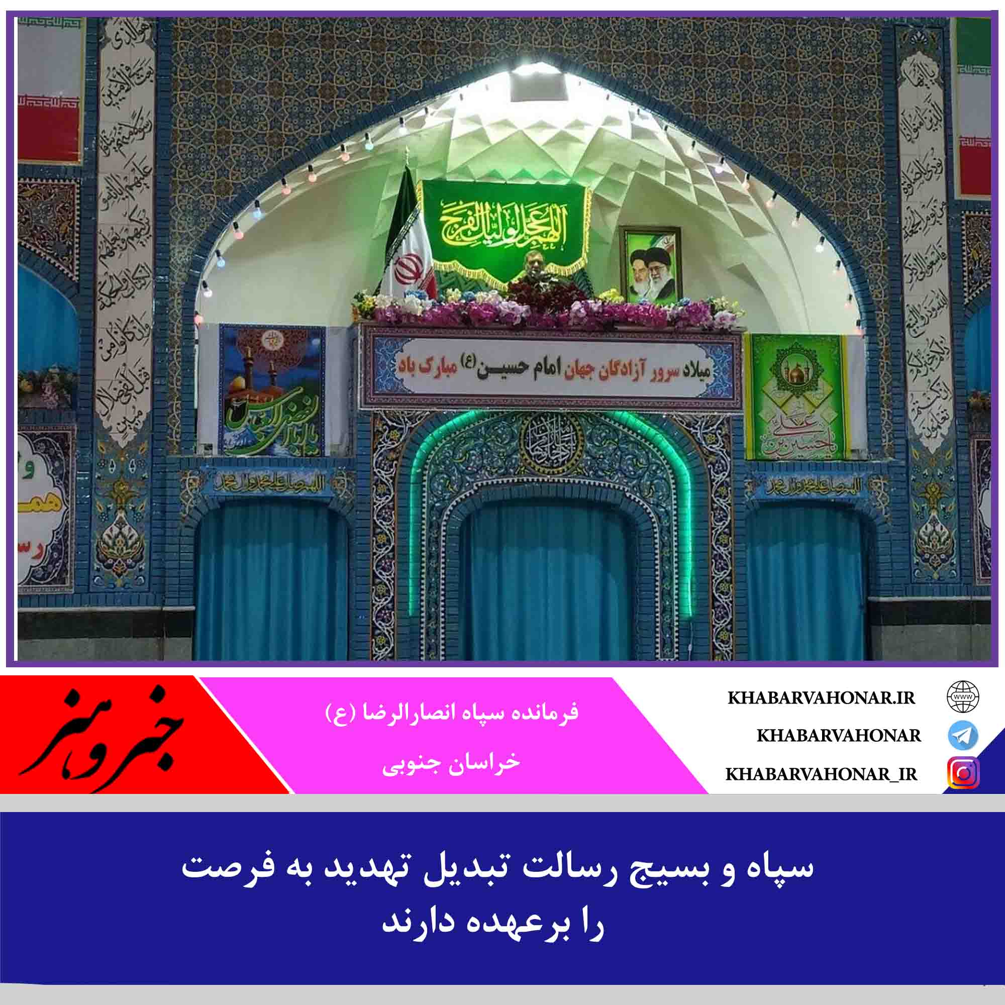 فرمانده سپاه انصارالرضا (ع) خراسان جنوبی گفت: برای عبور از چالشها باید تهدیدها به فرصت تبدیل شود و این رسالتی است که سپاه و بسیج در کنار دستگاههای اجرایی برعهده دارند.