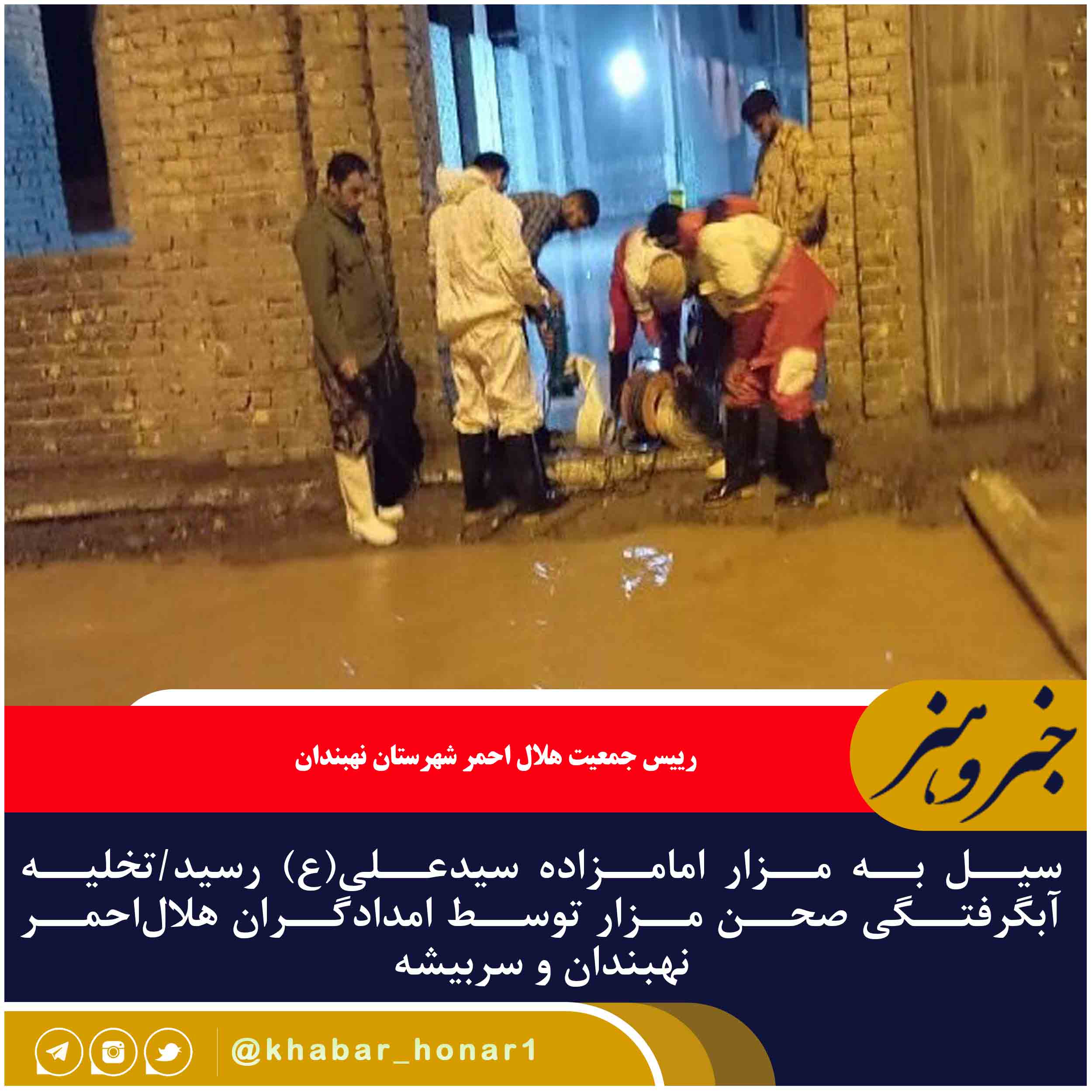 رییس جمعیت هلال احمر شهرستان نهبندان با اشاره به آبگرفتگی صحن مزار سیدعلی (ع) گفت: با تلاش امدادگران هلالاحمر دو شهرستان نهبندان و سربیشه آبگرفتگی در محوطه حرم تخلیه شد.