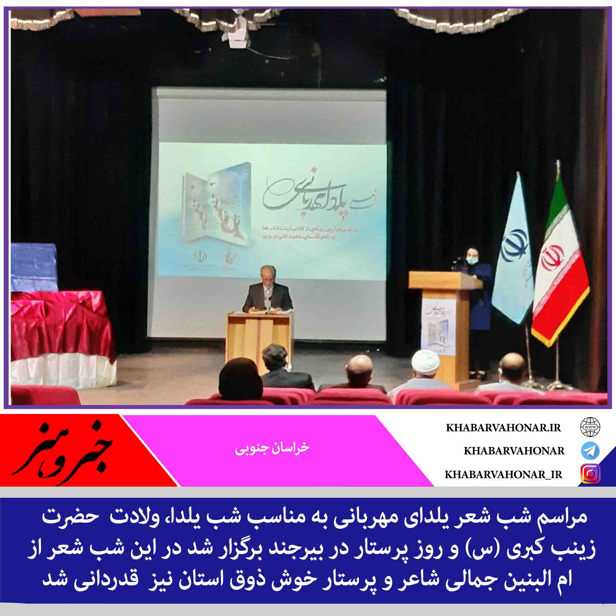 مراسم شب شعر یلدای مهربانی به مناسب شب یلدا، ولادت حضرت زینب کبری (س) و روز پرستار شامگاه دوشنبه یک دی ماه جاری در محل سالن گلبانگ برگزار شد.این شب شعر با توجه به شیوع ویروس کرونا با حضور تعداد محدودی از شعرا و به صورت مجازی برگزار شد.