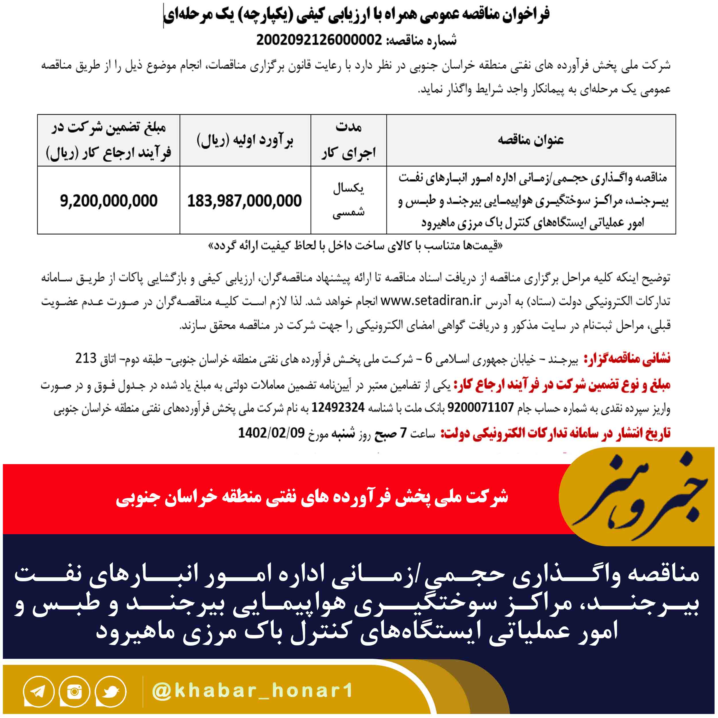 مناقصه واگـذاری حجـمی/زمـانی اداره امـور انبـارهای نفـت بیـرجنـد، مراکـز سوختگیـری هواپیمـایی بیرجنـد و طبـس و امور عملیاتی ایستگاه‌های کنترل باک مرزی ماهیرود یکسال شمسی ۱۸۳,۹۸۷,۰۰۰,۰۰۰ ۹,۲۰۰,۰۰۰,۰۰۰