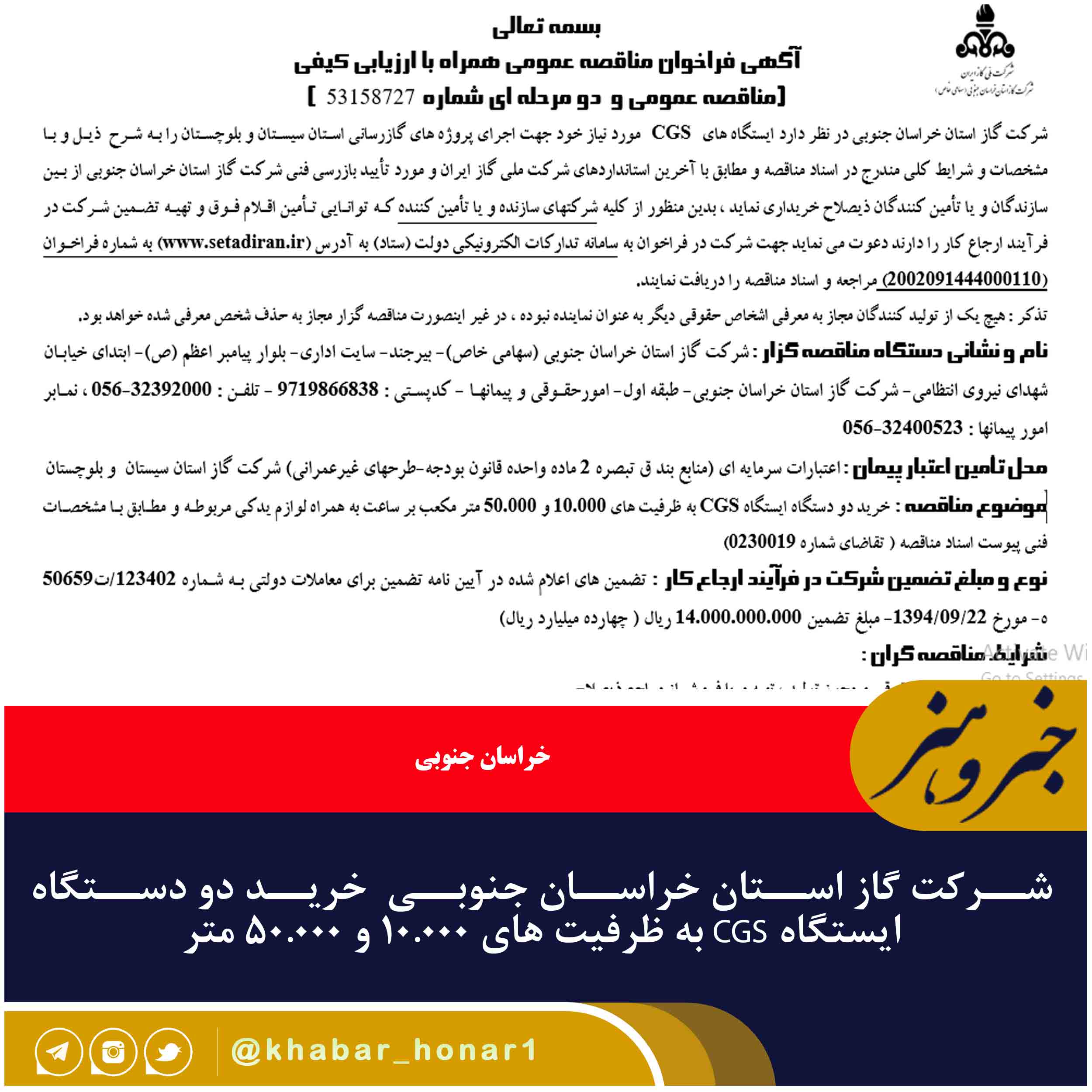 شرکت گاز استان خراسان جنوبی در نظر دارد ایستگاه های CGS مورد نیاز خود جهت اجرای پروژه های گازرسانی استان سیستان و بلوچستان را به شرح ذیل و با مشخصات و شرایط کلی مندرج در اسناد مناقصه و مطابق با آخرین استانداردهای شرکت ملی گاز ایران و مورد تأیید بازرسی فنی شرکت گاز استان خراسان جنوبی از بین سازندگان و یا تأمین کنندگان ذیصلاح خریداری نماید ، بدین منظور از کلیه شرکتهای سازنده و یا تأمین کننده که توانایی تأمین اقلام فوق و تهیه تضمین شرکت در فرآیند ارجاع کار را دارند دعوت می نماید جهت شرکت در فراخوان به سامانه تدارکات الکترونیکی دولت (ستاد) به آدرس (www.setadiran.ir) به شماره فراخوان (۲۰۰۲۰۹۱۴۴۴۰۰۰۱۱۰) مراجعه و اسناد مناقصه را دریافت نمایند.