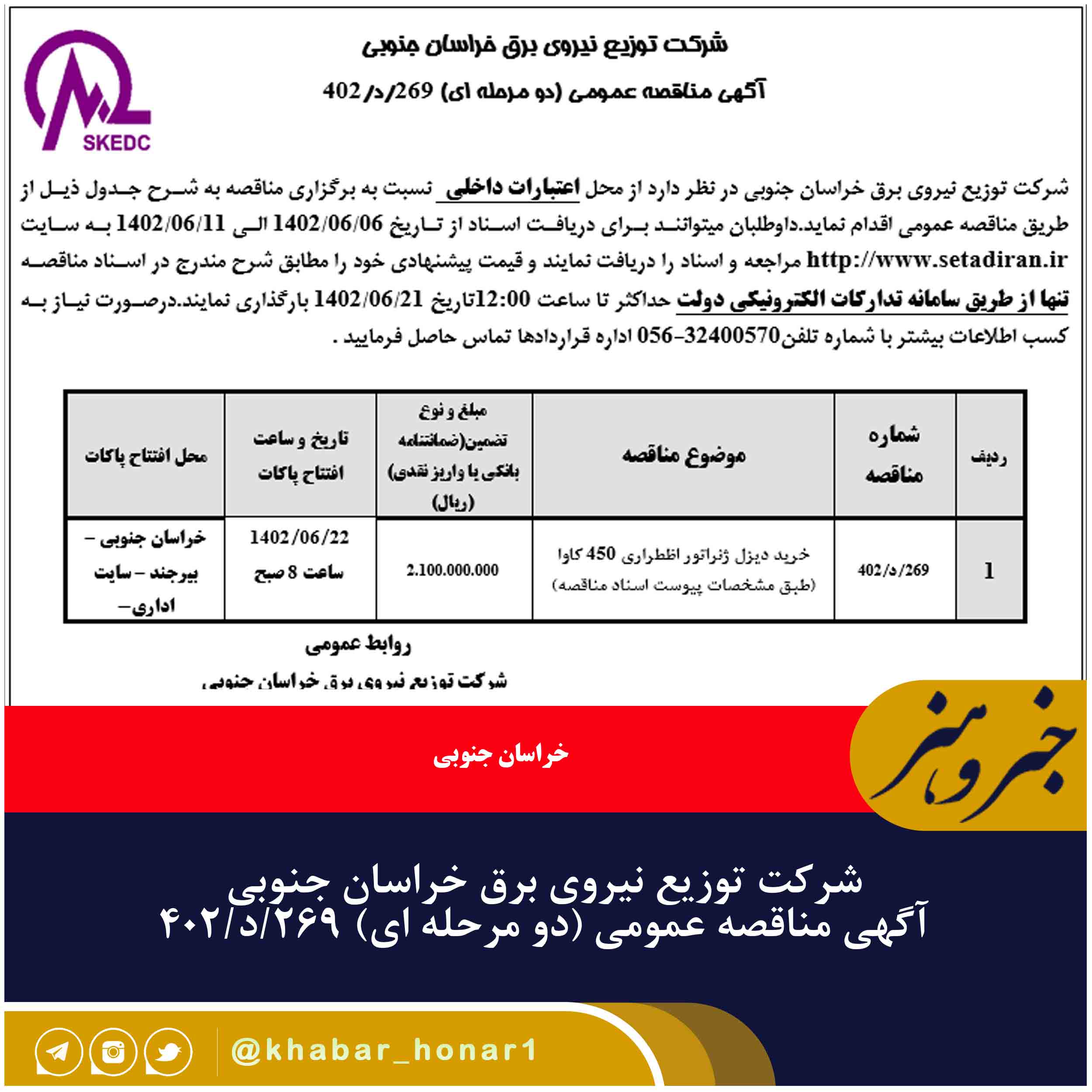 شرکت توزیع نیروی برق خراسان جنوبی آگهی مناقصه عمومی (دو مرحله ای) ۲۶۹/د/۴۰۲