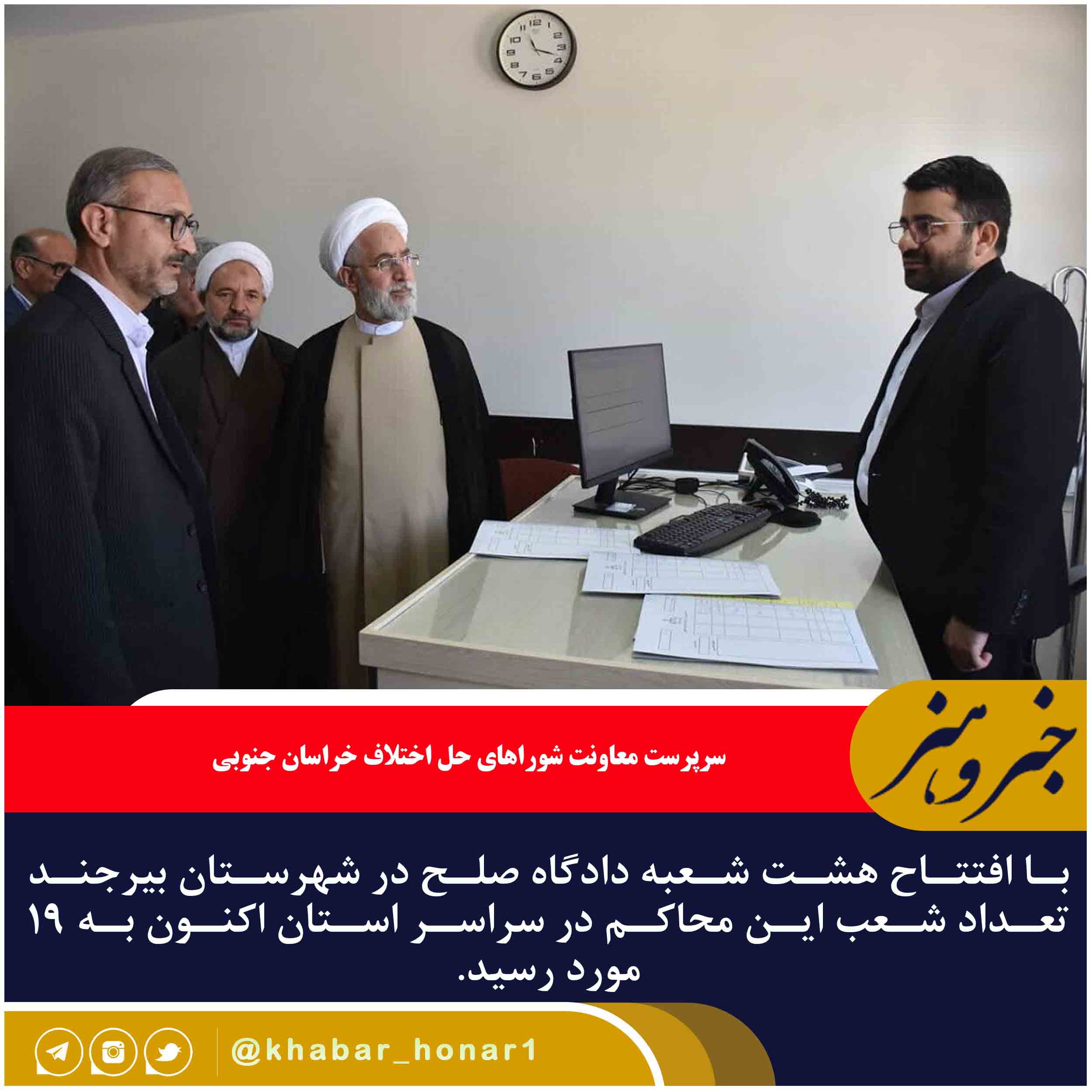 سرپرست معاونت شوراهای حل اختلاف خراسان جنوبی گفت: با افتتاح هشت شعبه دادگاه صلح در شهرستان بیرجند تعداد شعب این محاکم در سراسر استان اکنون به ۱۹ مورد رسید.