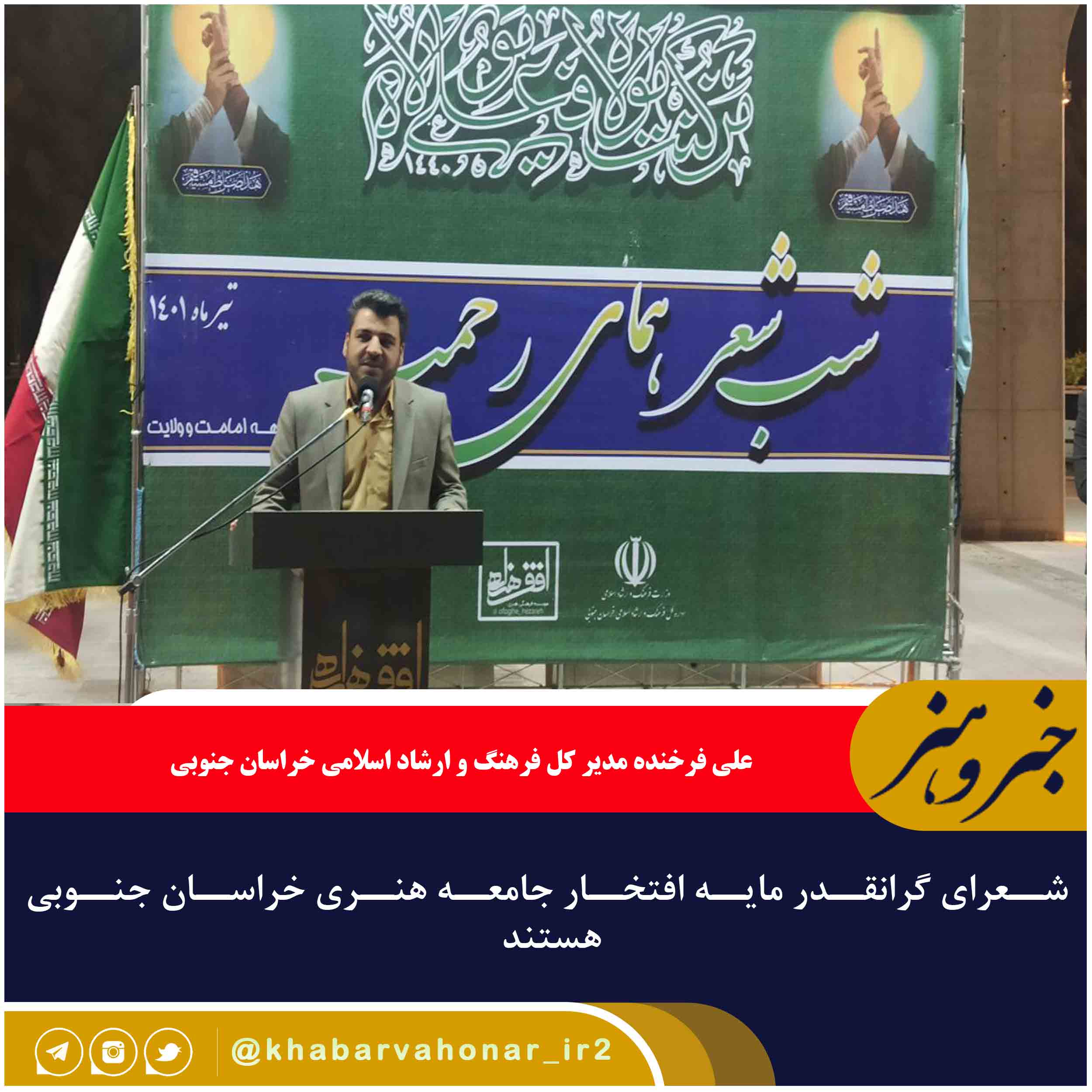 علی فرخنده مدیر کل فرهنگ و ارشاد اسلامی خراسان جنوبی در این شب شعر که شامگاه سه شنبه ۲۱ تیرماه برگزار شد، عنوان کرد: شعرای گرانقدری در استان داریم که مایه افتخار جامعه هنری خراسان جنوبی هستند.