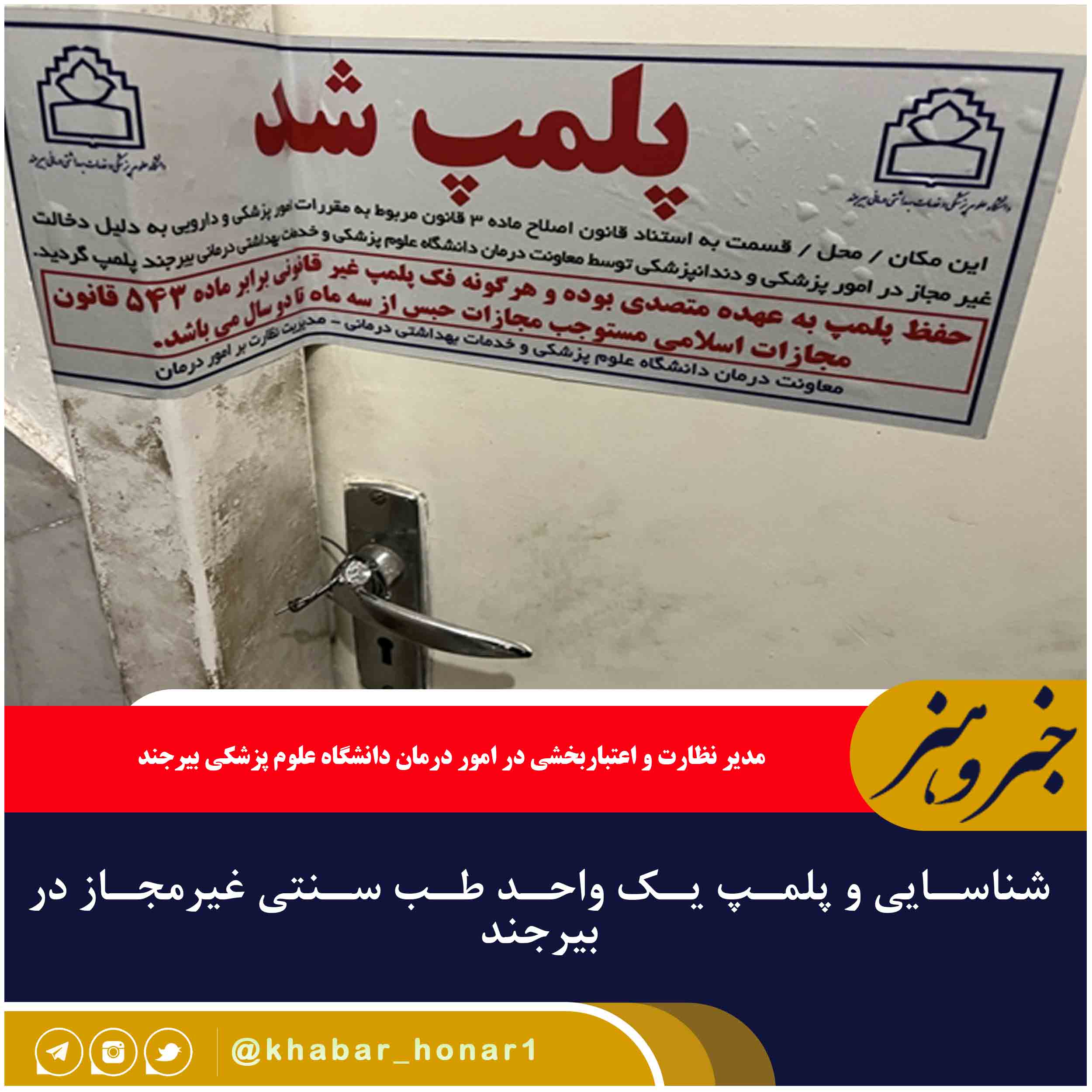 مدیر نظارت و اعتباربخشی در امور درمان دانشگاه گفت: به منظور صیانت از سلامت مردم و جلوگیری از فعالیت افراد فاقد صلاحیت در حوزه درمان طی بازدیدهای مستمر واحد مدیریت نظارت بر درمان دانشگاه در معیت پلیس اماکن یک واحد غیر مجاز طب سنتی با ارایه خدمات از قبیل : حجامت , ماساژ,…. در شهر بیرجند شناسایی, پلمپ و پرونده به مراجع ذی صلاح ارجاع گردید .
