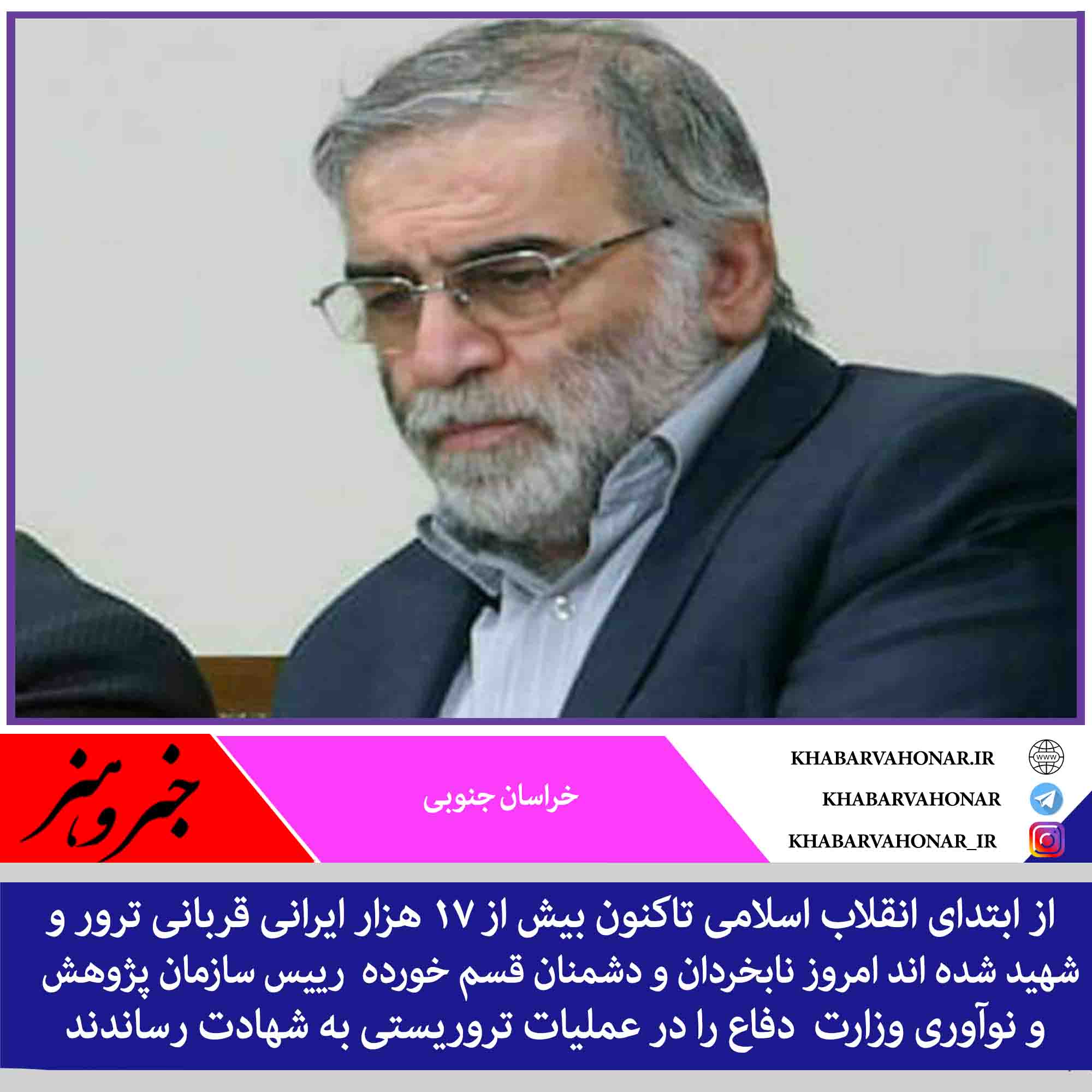 از ابتدای انقلاب اسلامی تاکنون بیش از ۱۷ هزار ایرانی قربانی تررور و شهید شده اند امروز نابخردان و دشمنان قسم خورده رییس سازمان پژوهش و نوآوری وزارت را دفاع در عملیات تروریستی به شهادت رساندند