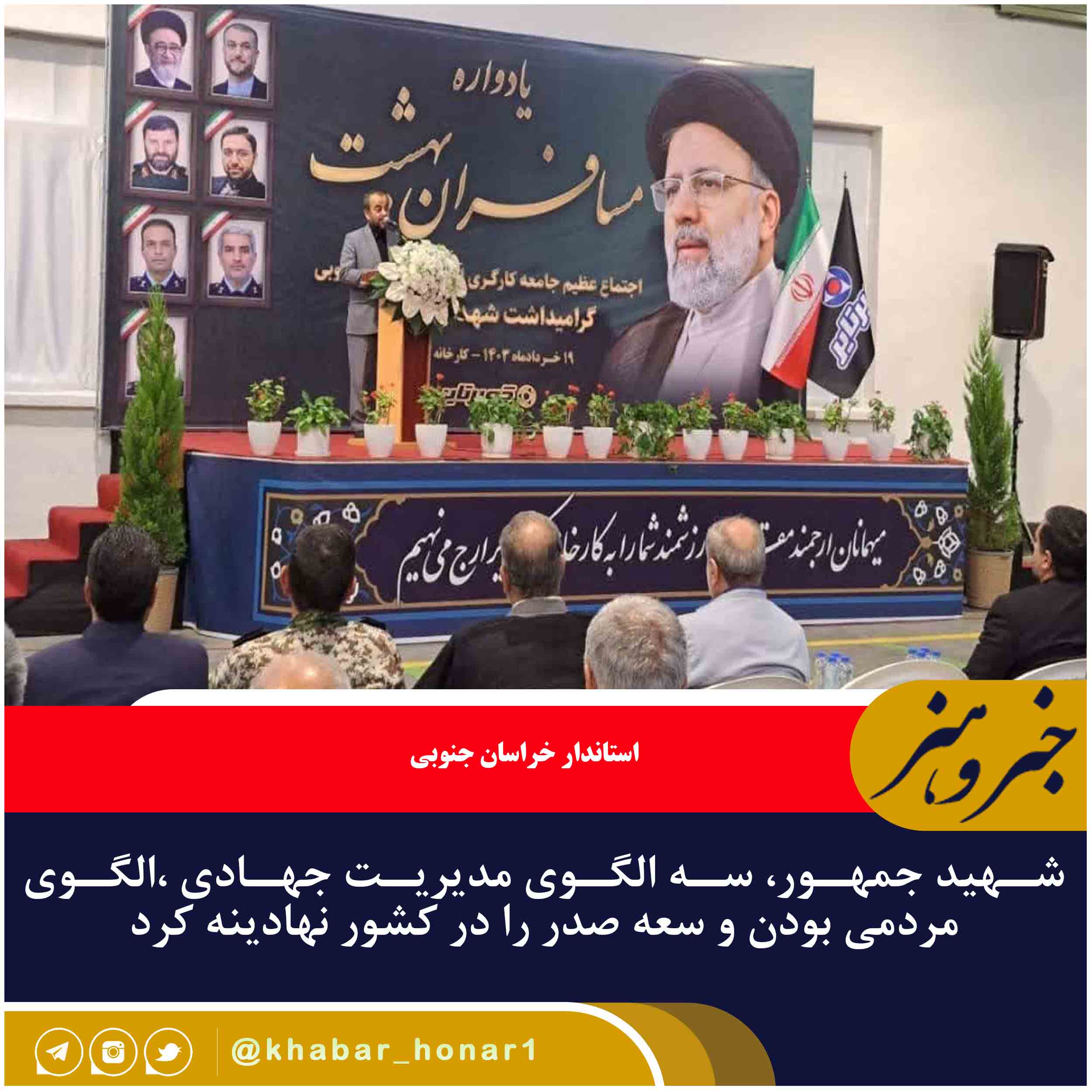 ?استاندار خراسان جنوبی گفت: شهید جمهور، سه الگوی مدیریتی از جمله مدیریت جهادی برگرفته از شهید سلیمانی، الگوی مردمی بودن برگرفته از شهید رجائی و سعه صدر برگرفته از شهید بهشتی را در سطح کشور نهادینه کرد.