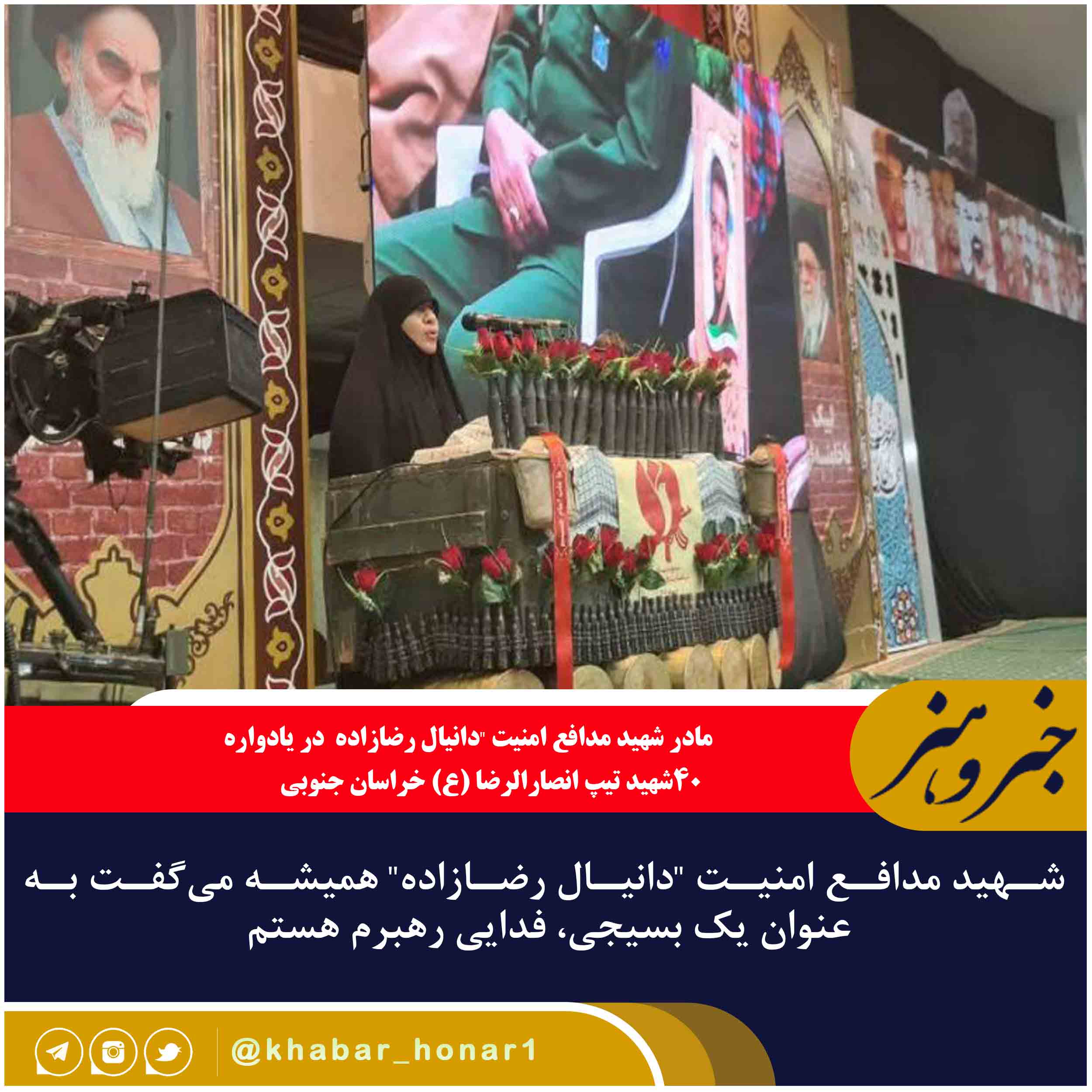 وی عنوان کرد: فرزندم همیشه میگفت به عنوان یک بسیجی، فدایی رهبرم هستم و دانیال با همه وجودش و بدون هیچ دریافتی خدمت میکرد، دانیال و دوستش حسین زینالزاده متعلق به همه کشور هستند و اگرچه دانیال به شهادت رسید اما صدها و بلکه هزاران دانیال دیگر را خداوند به من داد که امروز و بعد از شهادتش مرا مادر خطاب میکنند و فرزندان زیادی دارم.