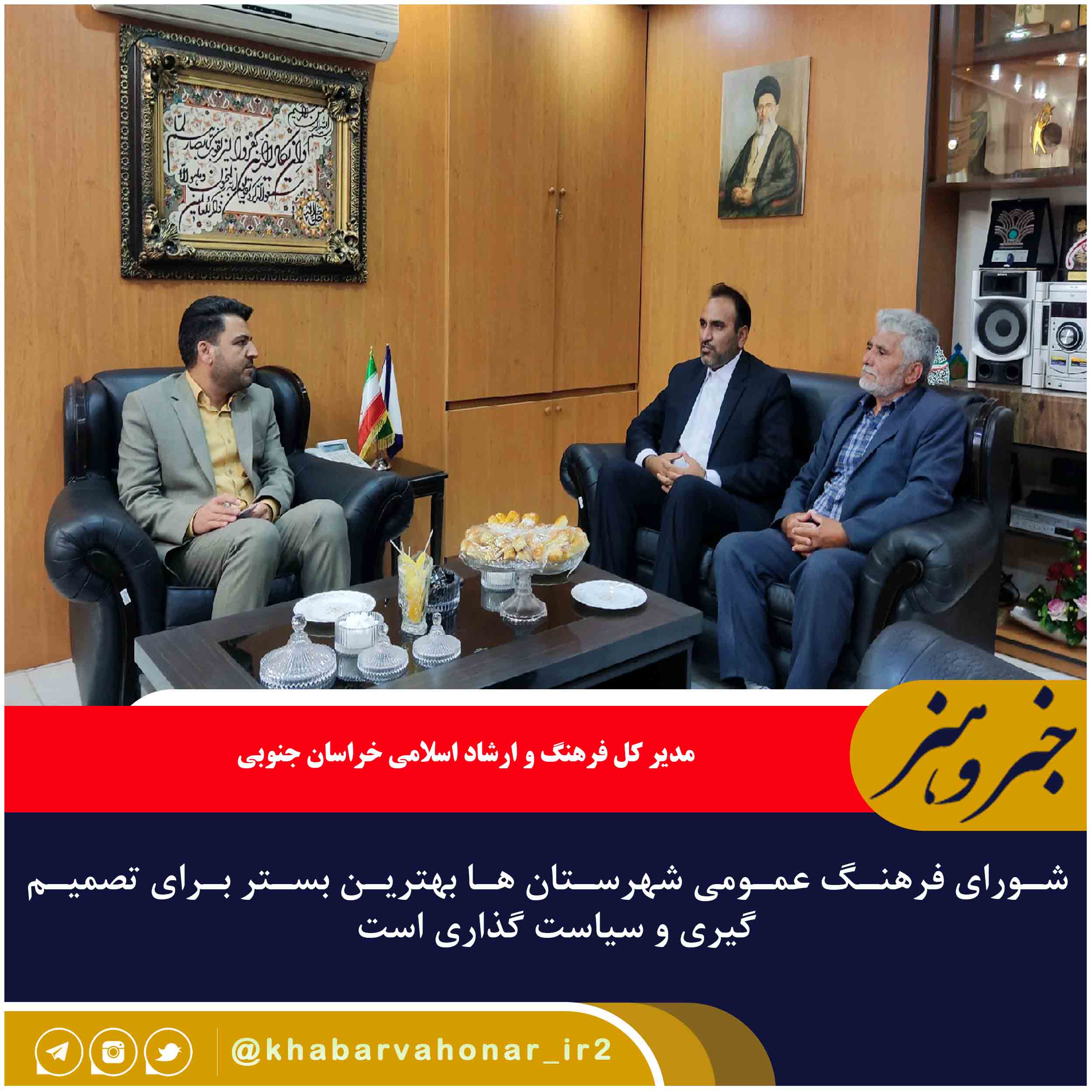مدیر کل فرهنگ و ارشاد اسلامی خراسان جنوبی بهترین بستر برای تصمیم گیری، سیاست گذاری و راهبری شهرستان را، شورای فرهنگ عمومی دانست و عنوان کرد: اولویت اصلی تعریف شده در شورای عالی انقلاب فرهنگی، تقویت هویت ملی و اسلامی است.