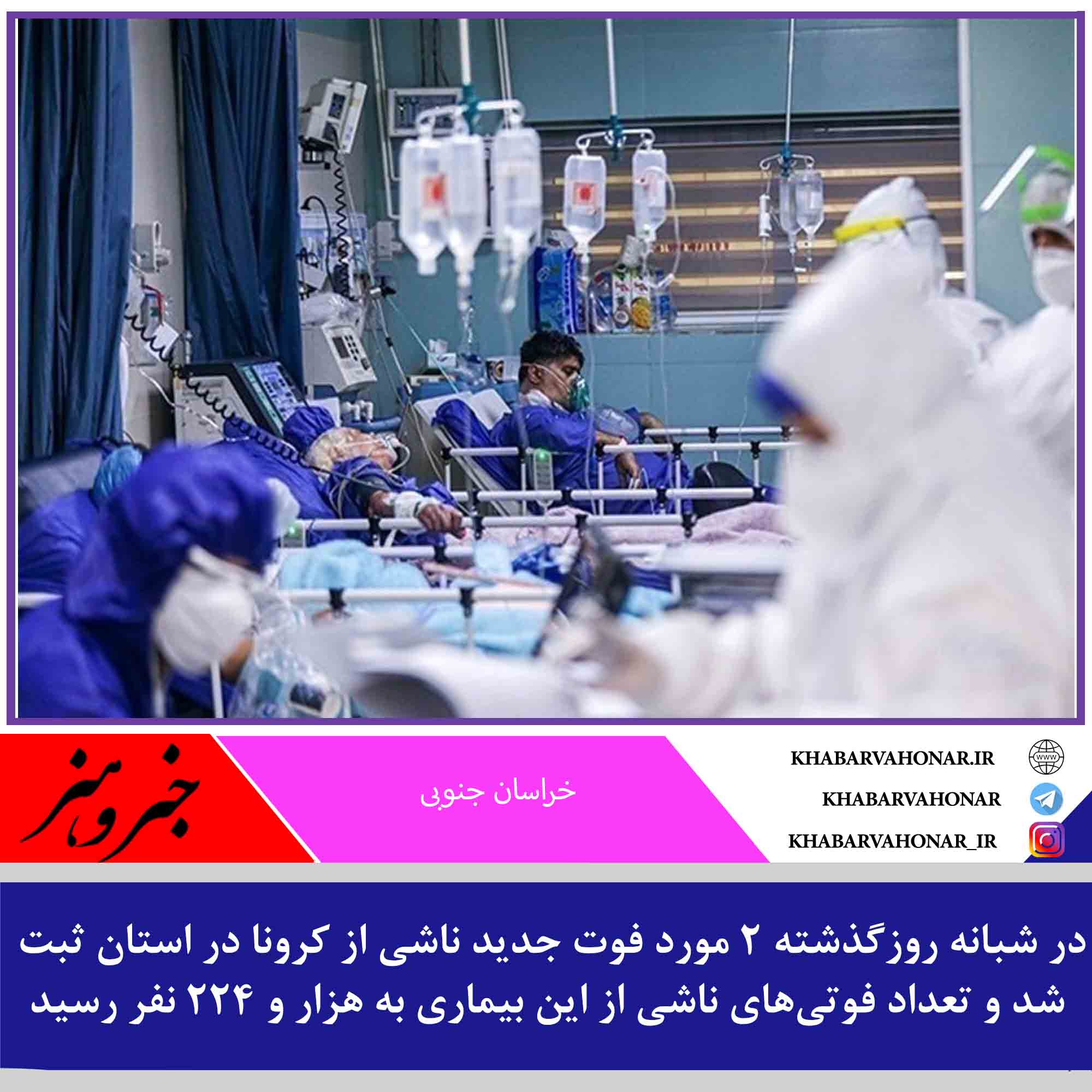 در شبانه روزگذشته ۲ مورد فوت جدید ناشی از کرونا در استان ثبت شد و تعداد فوتیهای ناشی از این بیماری به هزار و ۲۲۴ نفر رسید.