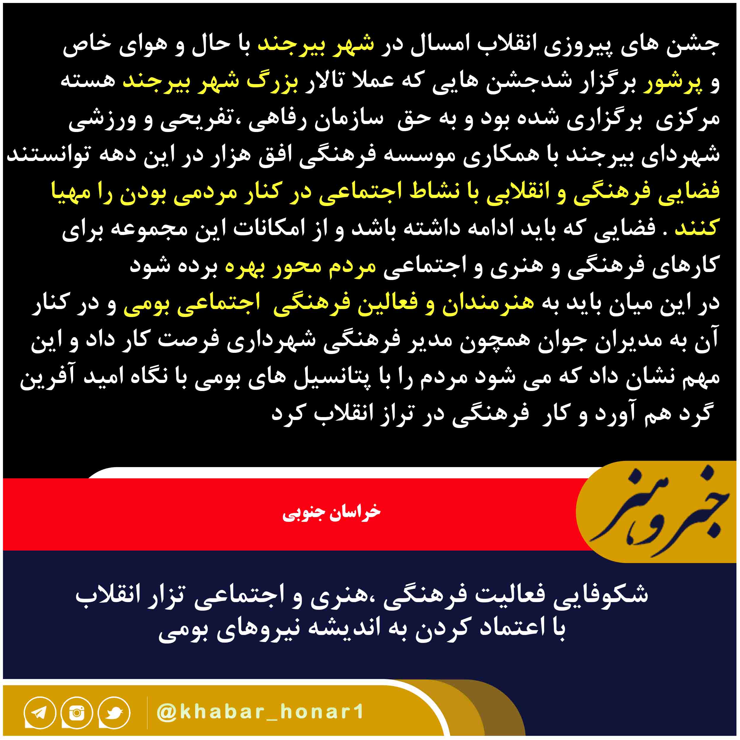 جشن های پیروزی انقلاب امسال در شهر بیرجند با حال و هوای خاص و پرشور برگزار شدجشن هایی که عملا تالار بزرگ شهر بیرجند هسته مرکزی برگزاری شده بود و به حق سازمان رفاهی ،تفریحی و ورزشی شهردای بیرجند با همکاری موسسه فرهنگی افق هزار در این دهه توانستند فضایی فرهنگی و انقلابی با نشاط اجتماعی در کنار مردمی بودن را مهیا کنند . فضایی که باید ادامه داشته باشد و از امکانات این مجموعه برای کارهای فرهنگی و هنری و اجتماعی مردم محور بهره برده شود در این میان باید به هنرمندان و فعالین فرهنگی اجتماعی بومی و در کنار آن به مدیران جوان همچون مدیر فرهنگی شهرداری فرصت کار داد و این مهم نشان داد که می شود مردم را با پتانسیل های بومی با نگاه امید آفرین گرد هم آورد و کار فرهنگی در تراز انقلاب کرد