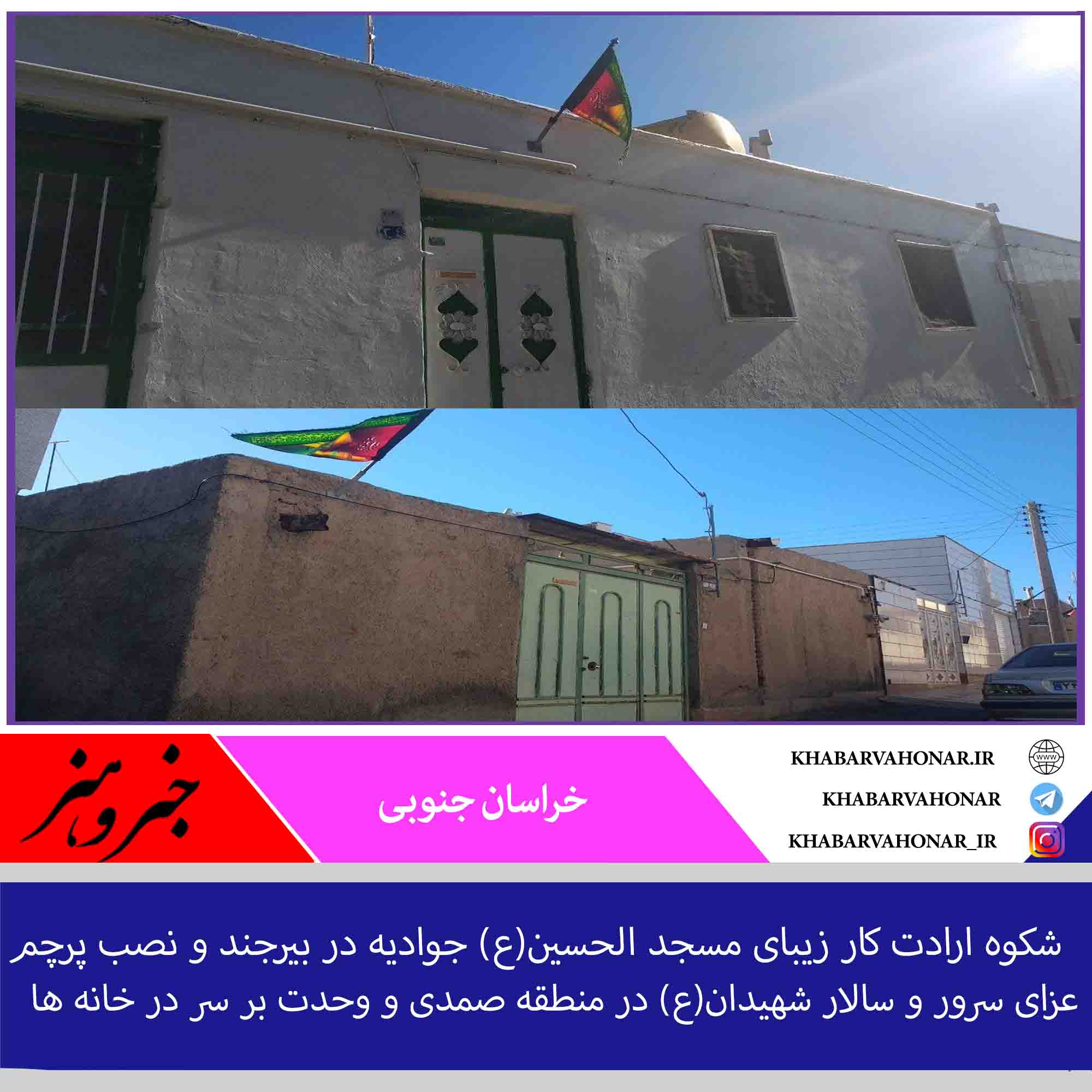 شکوه ارادت کار زیبای مسجد الحسین(ع) جوادیه در بیرجند و نصب پرچم عزای سرور و سالار شهیدان(ع) در منطقه صمدی و وحدت بر سر در خانه ها