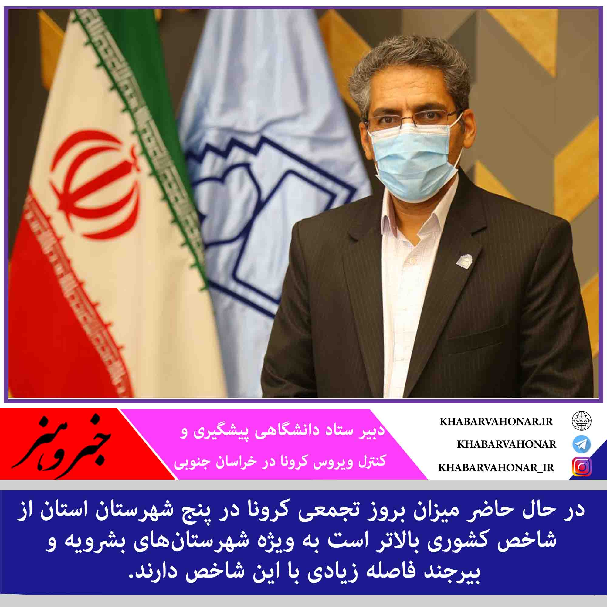 دبیر ستاد دانشگاهی پیشگیری و کنترل ویروس کرونا در خراسان جنوبی گفت: در حال حاضر میزان بروز تجمعی کرونا در پنج شهرستان استان از شاخص کشوری بالاتر است به ویژه شهرستانهای بشرویه و بیرجند فاصله زیادی با این شاخص دارند.