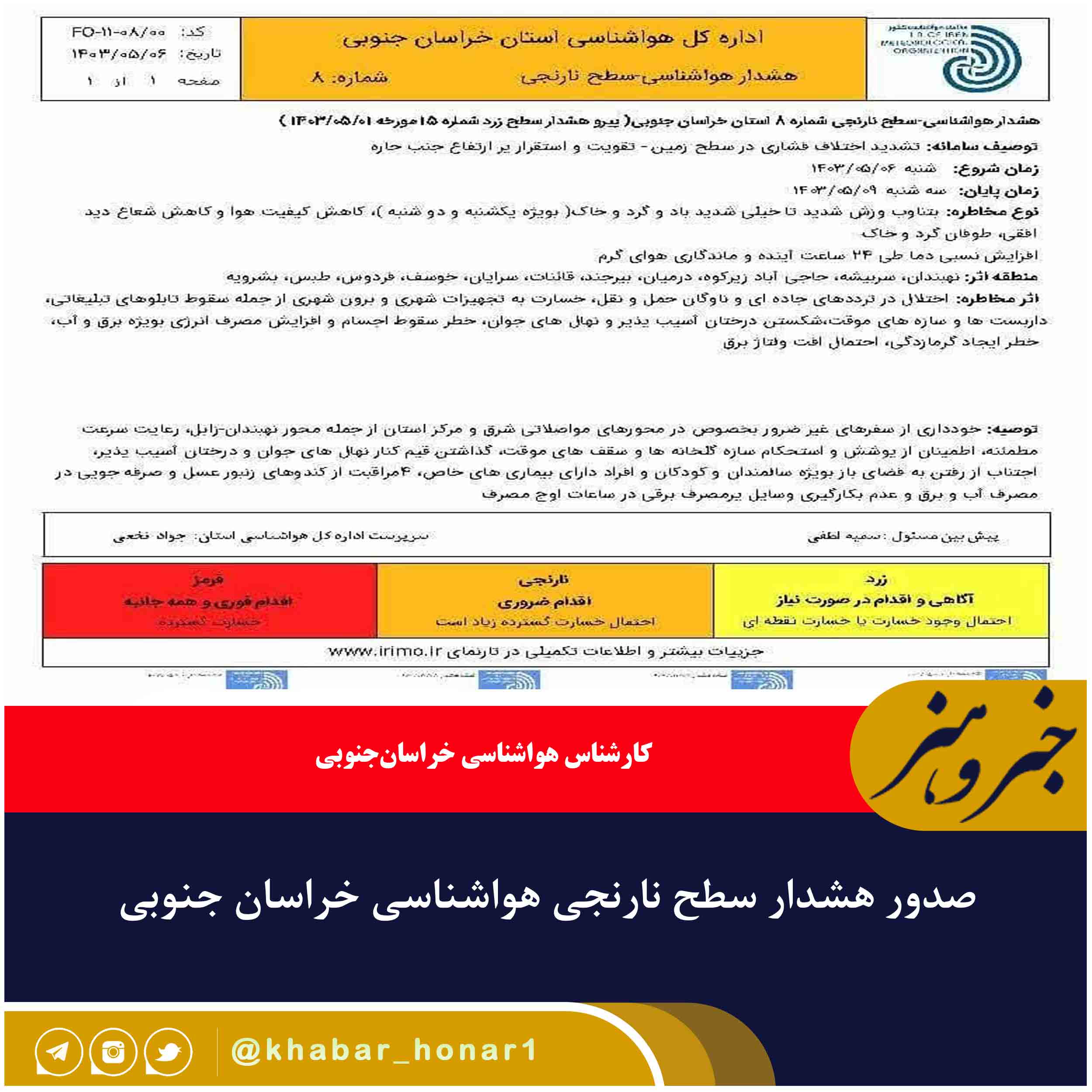 لطفی افزود: برای شهرستانهای نهبندان، سربیشه، حاجی آباد زیرکوه، درمیان، بیرجند، قائنات، سرایان، خوسف، فردوس، طبس و بشرویه هشدار نارنجی صادر شده است.