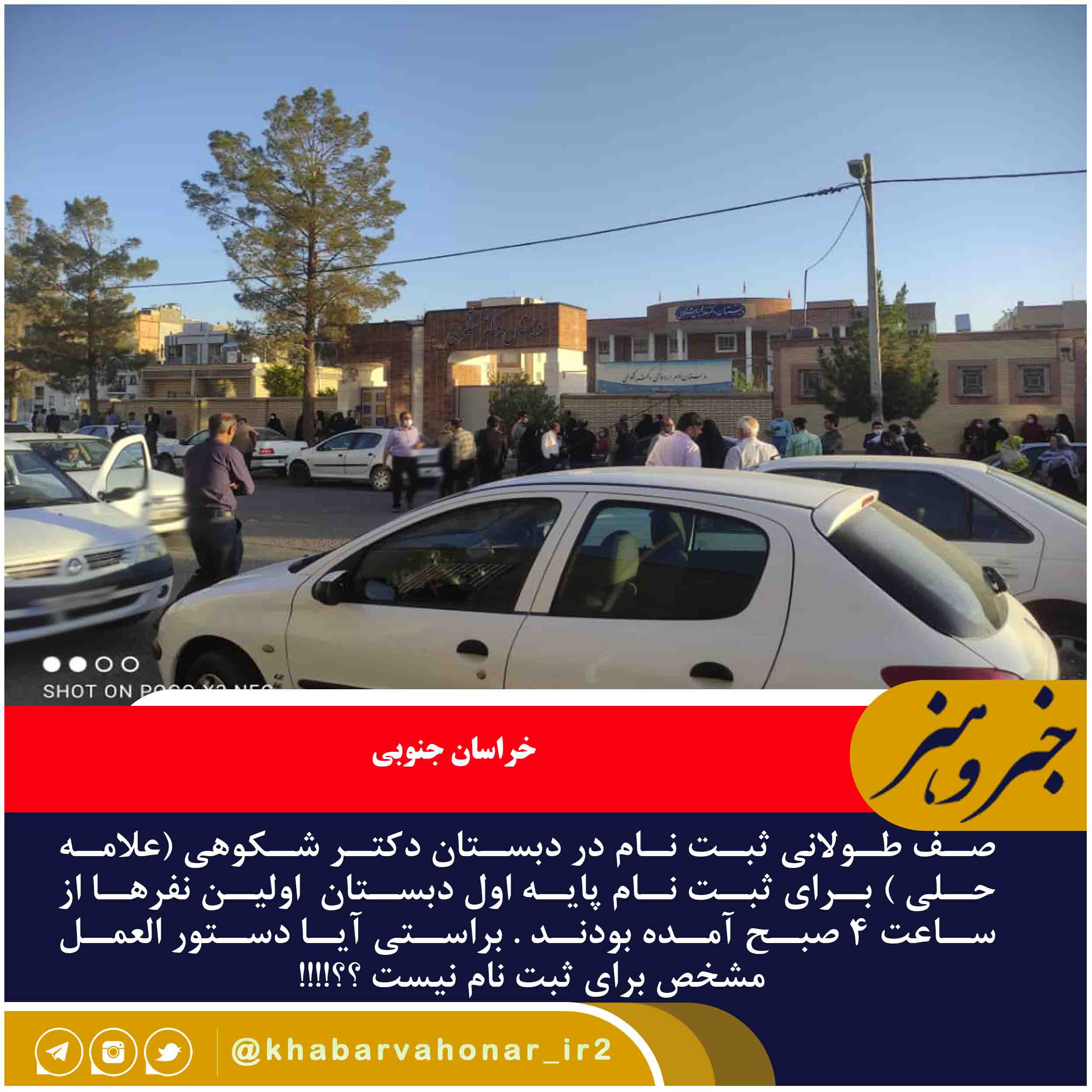 صف طولانی ثبت نام در دبستان دکتر شکوهی (علامه حلی ) برای ثبت نام پایه اول دبستان اولین نفرها از ساعت ۴ صبح آمده بودند . براستی آیا دستور العمل مشخص برای ثبت نام نیست ؟؟!!!!