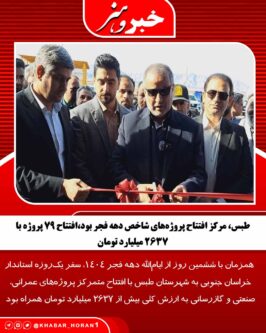 همزمان با ششمین روز از ایامالله دهه فجر ۱۴۰۴، سفر یکروزه استاندار خراسان جنوبی به شهرستان طبس با افتتاح متمرکز پروژههای عمرانی، صنعتی و گازرسانی به ارزش کلی بیش از ۲۶۳۷ میلیارد تومان همراه بود. در جریان این سفر، علاوه بر بهرهبرداری از کارخانه عظیم تولید اکسید سرب و روی، مدرسه ۶ کلاسه مهرعظام و پروژههای بسیج سازندگی نیز به بهرهبرداری رسیدند که استاندار بر نقش حیاتی توسعه صنایع معدنی در جلوگیری از خامفروشی تأکید ویژهای داشت.