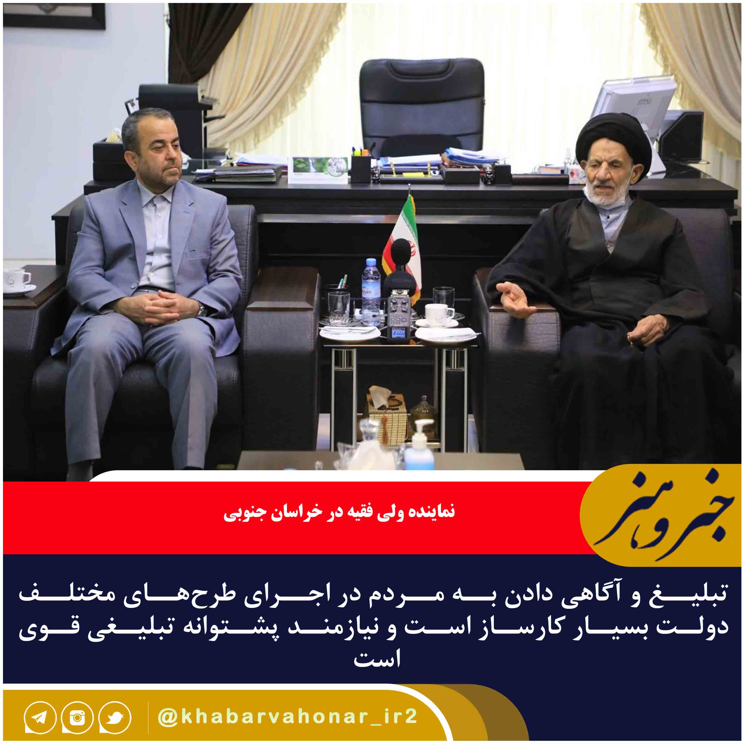 نماینده ولی فقیه در خراسان جنوبی و امام جمعه بیرجند گفت: تبلیغ و آگاهی دادن به مردم در اجرای طرحهای مختلف دولت بسیار کارساز است و نیازمند پشتوانه تبلیغی قوی است.