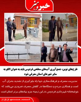 عباس سارانی نیز در جریان این بازدید، ضمن تقدیر ویژه از اقدامات شهرداری فردوس در حوزه صرفهجویی منابع آب اظهار داشت: عملکرد موفق شهرداری فردوس در اجرای طرحهای نوین، جمعآوری آبهای سطحی و اتصال کامل آنها به مقصد، باید به عنوان الگو به سایر شهرهای استان معرفی شود.
